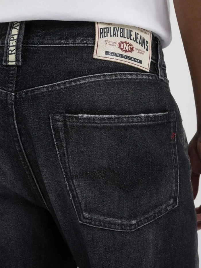 Sirged teksapüksid, millel on korrapäraselt tõusev vöökoht ja lõdvestunud sirge sääreosa puusast allääreni. See viie taskuga tükk on valmistatud mustast 12-untsisest taaskasutatud puuvillasest teksast, keskmise ökopesuga ja seejärel kuivatatakse mannekeenil. Sellel tükil on käsitsi loodud vurrud ja lihvitud detailid, aga ka marrastused taskute servadel ja alläärel, mis loovad kulumispiirkondadele värvikontrasti. TheReplay kirjasilmus ja kaubamärgiga silt tagaküljel viimistlevad neid meeste teksaseid. Taaskasutatud puuvilla kasutamine kinnitab Replay pühendumust jätkusuutlikule moele. Nööpidega kinnitus.