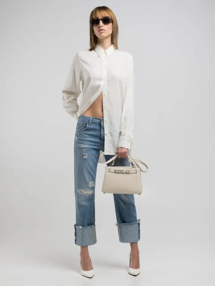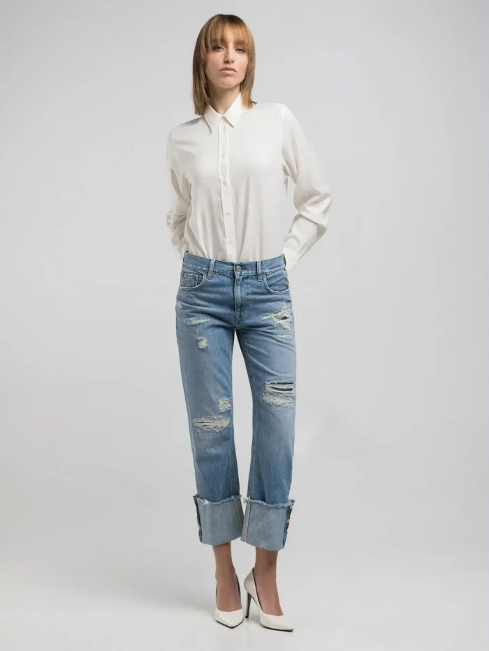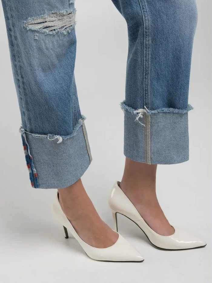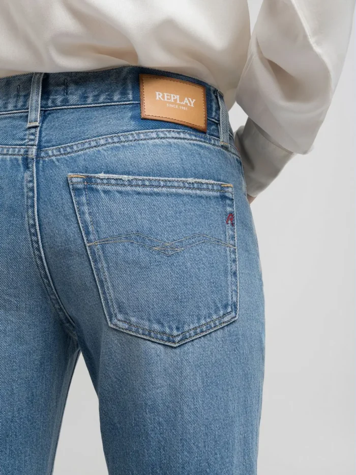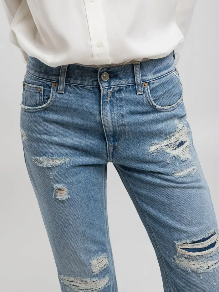 Sirge lõikega teksad madala vöökoha ja sirge säärega. Need teksad on valmistatud 11-untsisest lüotsell/puuvillast indigosinist teksariidest, mis on kergelt kivipesu ja pleegituspesuga töödeldud ning viimase pehmendajaga töödeldud. Sellel viie taskuga teksariidel on käsitsi tehtud vurrud ja kriimud ning suured lapitud ja parandatud rebendid, mis loovad kulumiskohtadele värvikontrasti, samas kui kerge värvitöötlus vannis annab teksariidele vananenud ilme. Tagumistel taskutel on meie ikoonilised kajakatiibadega õmblused ja ühel taskul on R-tikand, samas kui ühel esitaskul on väike kaubamärgiga sisetükk. Lukk, nööpkinnitus