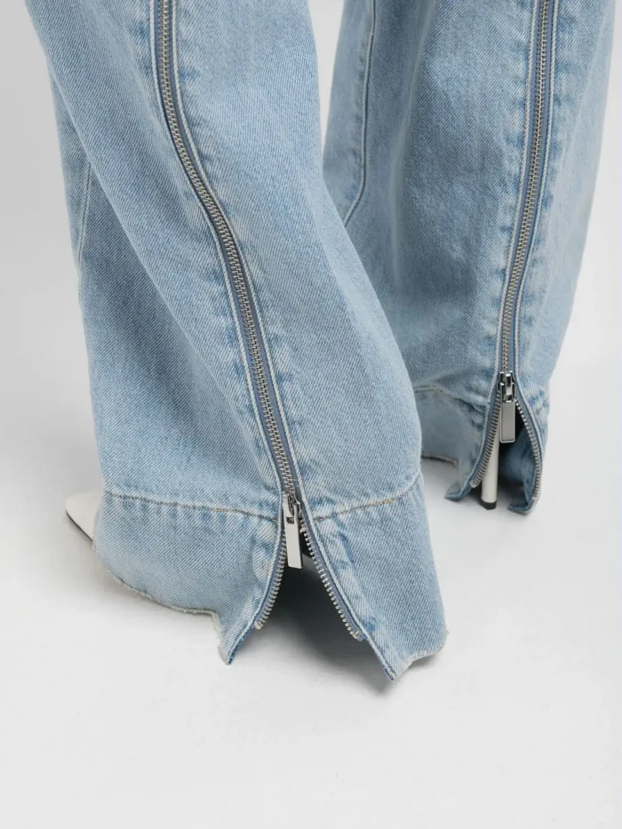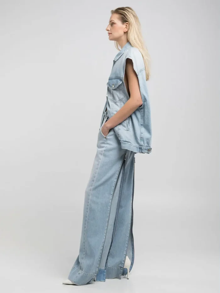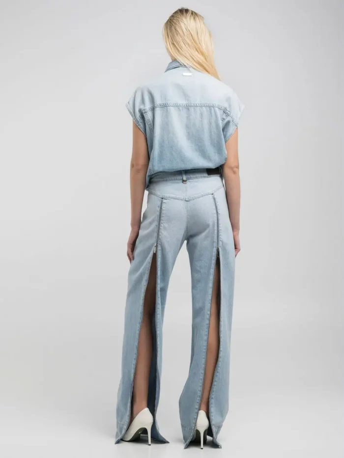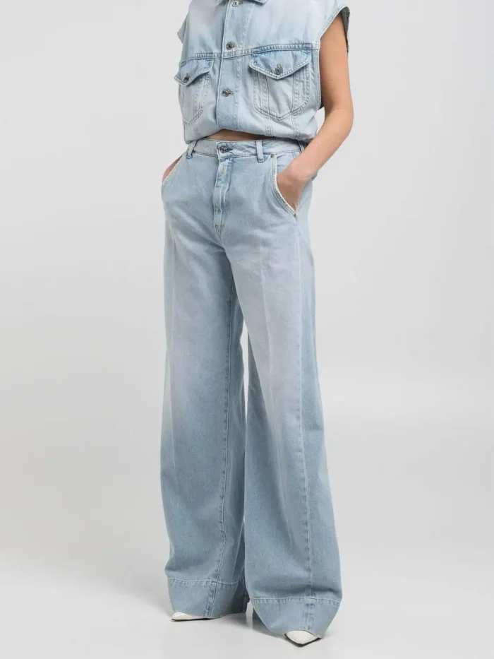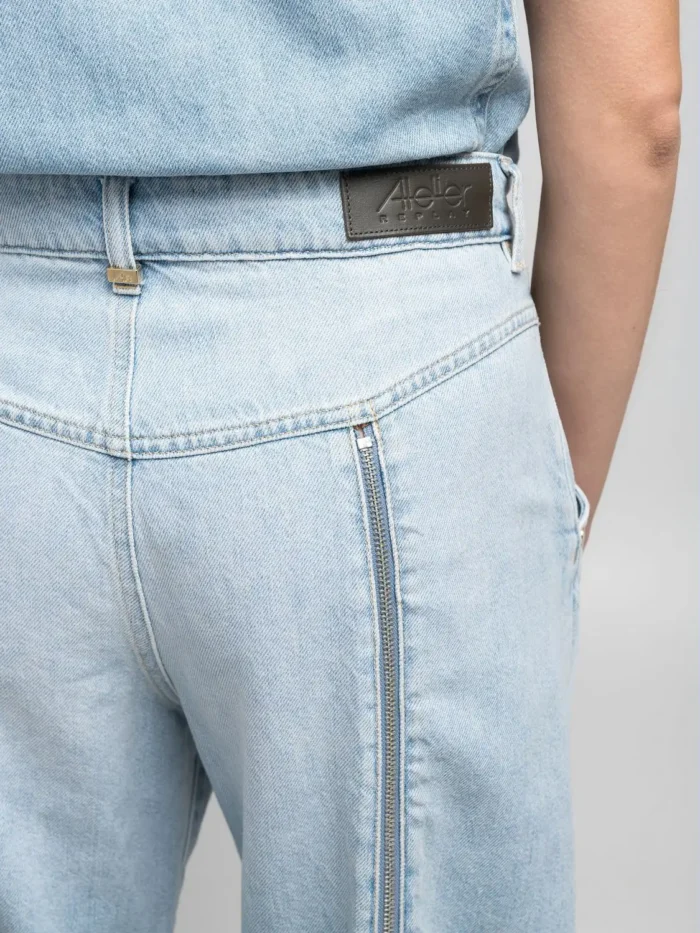 Kõrge vöökohaga, laiad ja sirgete säärega teksad 11-untsisest lüotsell-puuvilla indigosinist teksariidest, kerge pesu ja kerge määrdumistöötlusega lõpus. Sellel disainil on kulumiskohtadel kulunud efekt ning taskutel käehaardejäljed ja hõõrdumised. Seda disaini eristab kogu sääre pikkuses kulgev tõmblukk, mis võimaldab pilude pikkust reguleerida. Luku- ja nööpkinnitus. See toode kuulub Atelieri kollektsiooni, mis on tagasihoidlike ja naiselike rõivaste sari, mis on loodud kestma.