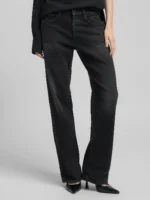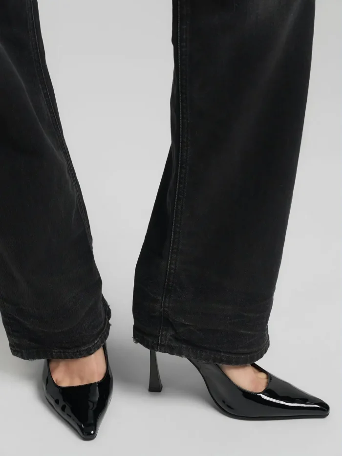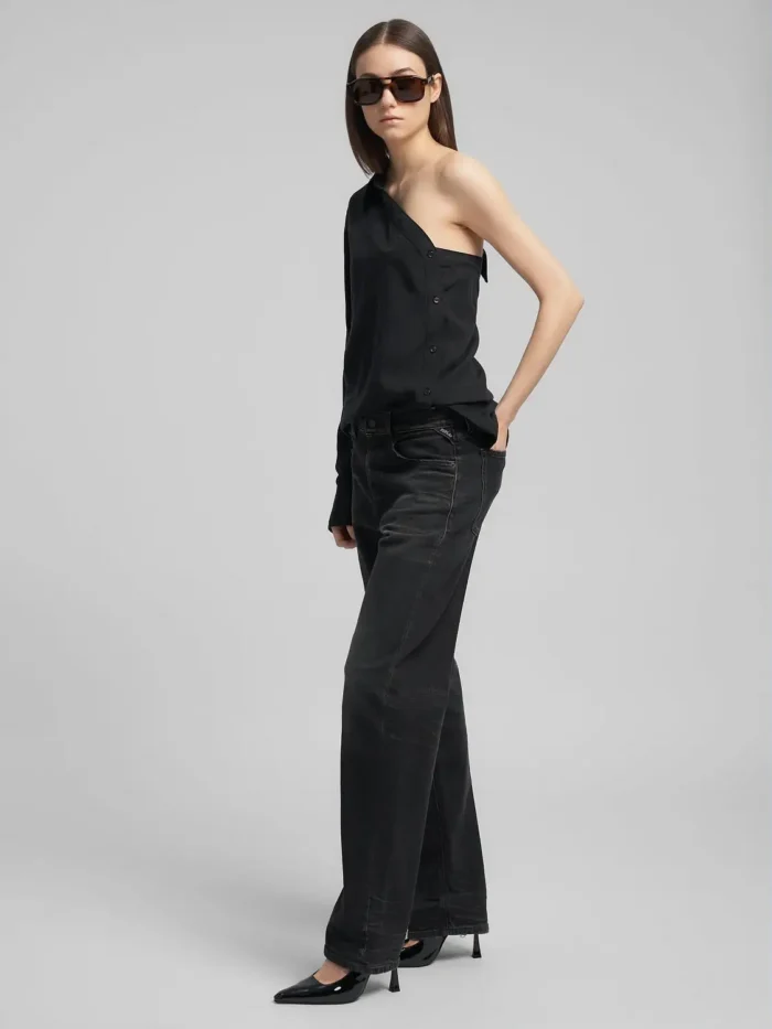 Boy-fit teksad madala vöökoha ja sirge säärega. Need viie taskuga teksad on valmistatud 11,5-untsisest mustast puuvillasest mugavast teksariidest, mis on ülevärvitud mustaks esialgse vaigupesu, keskmise kivipesu ja pleegituspesuga ning kergelt töödeldud värviga vannis, mis annab teksariidele vananenud ilme. Need naiste teksad paistavad silma ka oma vurrude ja kriimustuste poolest, mis loovad kulumispiirkondadele kontrasti. Väike eritellimusel tehtud sisetükk ühel esitaskul ja meie ikooniline R-tikand tagataskul täiendavad disaini. Nööpkinnitus.