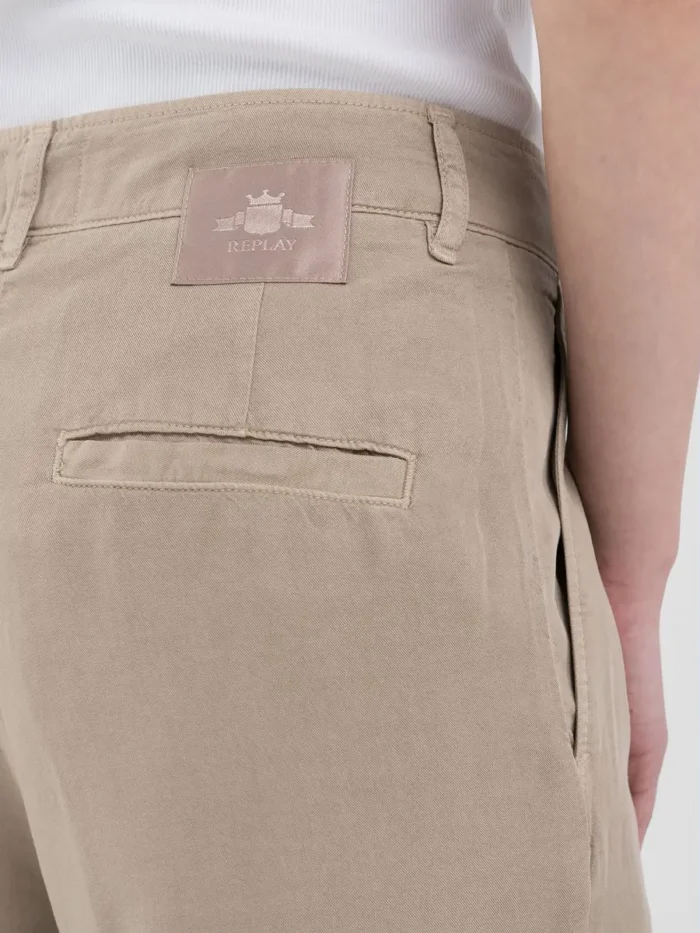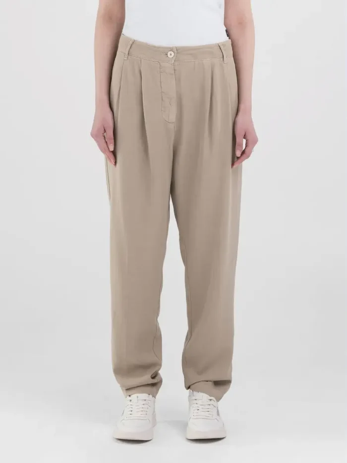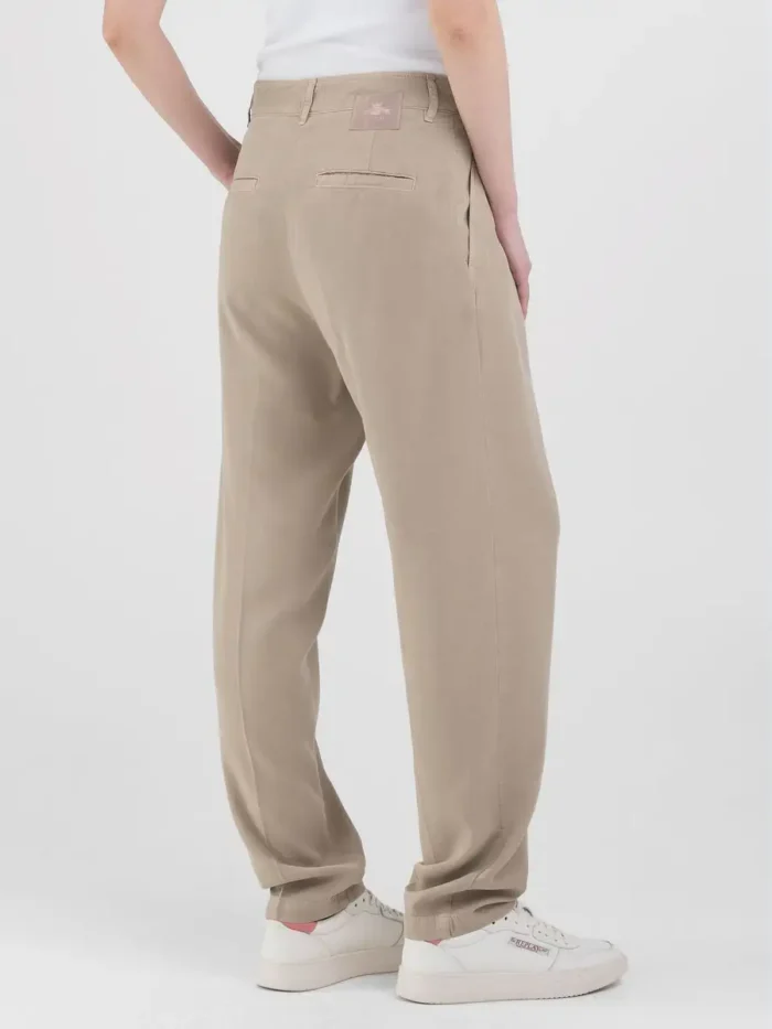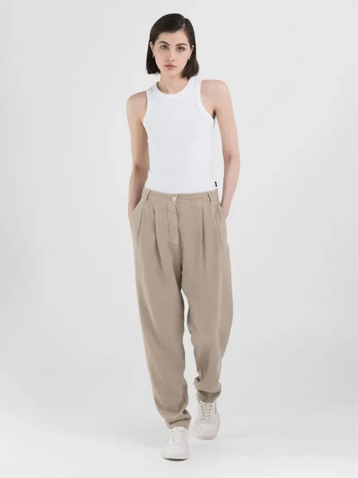 Kõrge vöökohaga boyfit kitseneva säärega püksid. Külgvoltsidega rõivas on valmistatud Lyocellist ning seda täiustavad kaks kaldus taskut ja kaks seljataskut. Tõmblukk ja nööp.