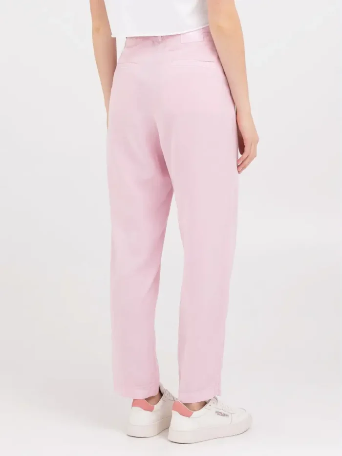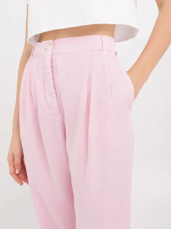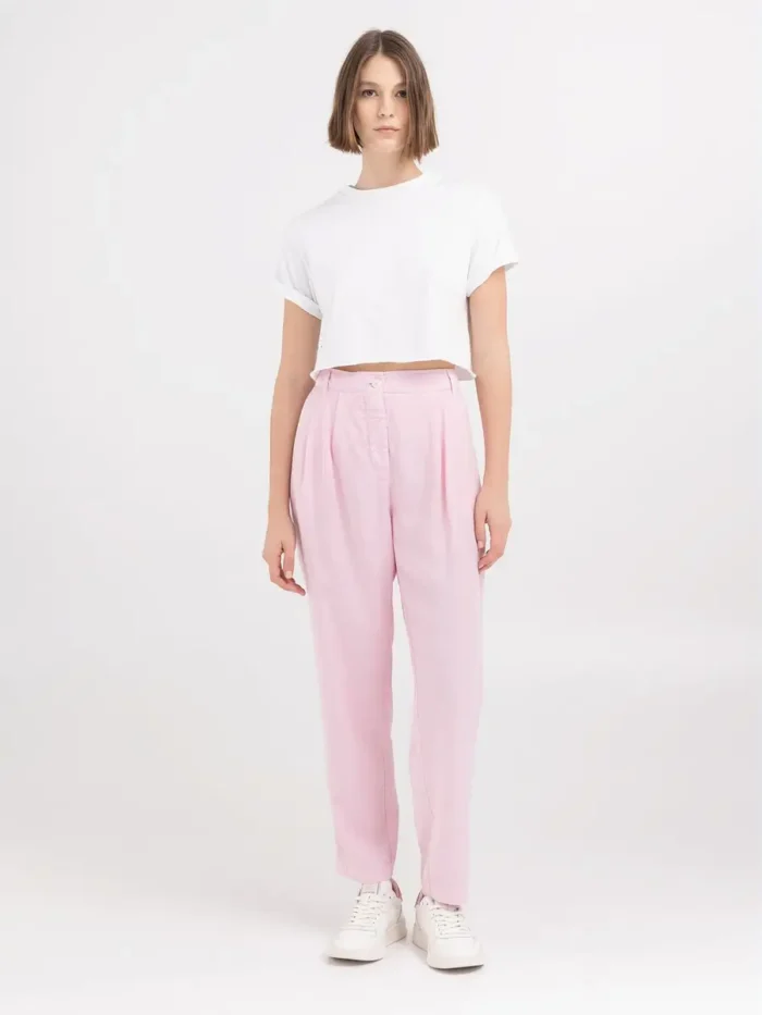 Kõrge vöökohaga boyfit kitseneva säärega püksid. Külgvoltsidega rõivas on valmistatud Lyocellist ning seda täiustavad kaks kaldus taskut ja kaks seljataskut. Tõmblukk ja nööp.