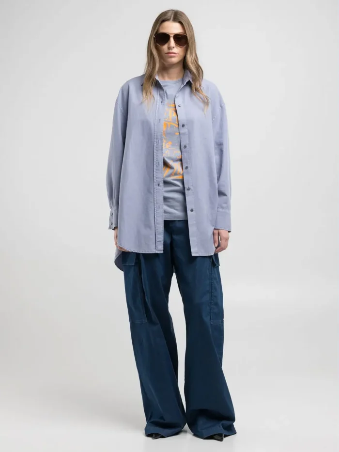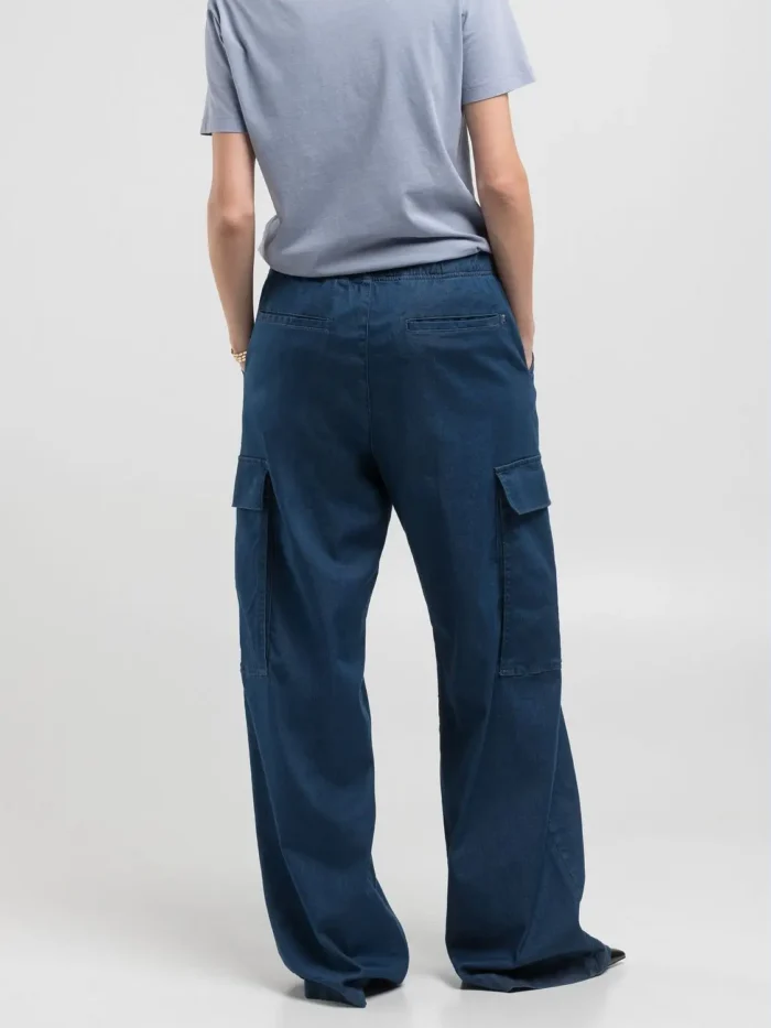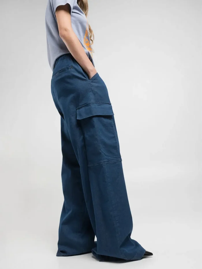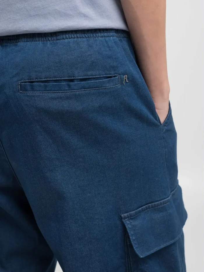 Püksid on valmistatud indigo-teksakangast, mis on valmistatud ülipehmest 8-untsisest kõrgekvaliteedilisest venivast puuvillast, mida on loputatud ja kuivatatud. Sellel disainil on reguleeritav nööriga vöökoht ja avar, pingevaba istuvus ning lai jalg puusast allääreni. Diskreetsed küljetaskud, suured funktsionaalsed taskud säärtel ja rafineeritud seljataskud, millest üks on viimistletud ikoonilise R-neediga, täiendavad disaini.