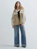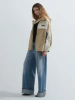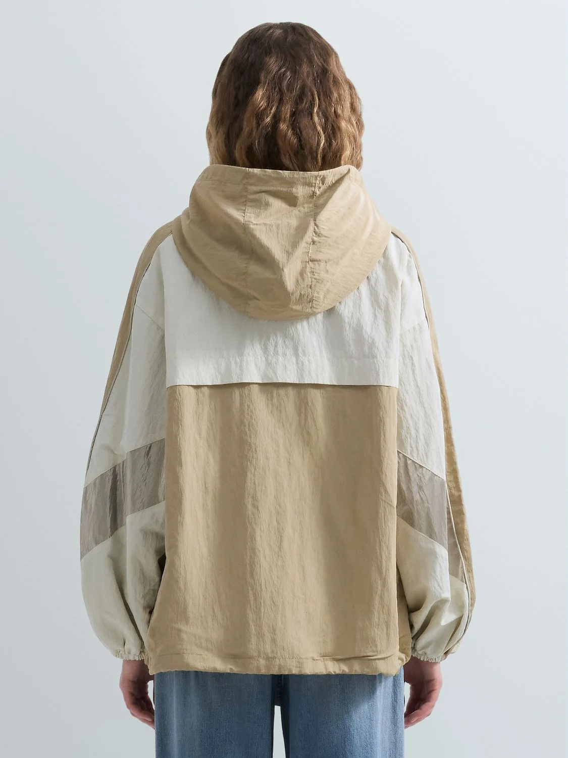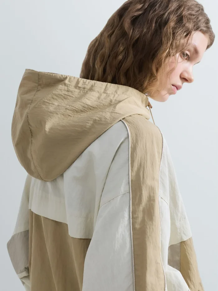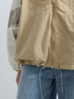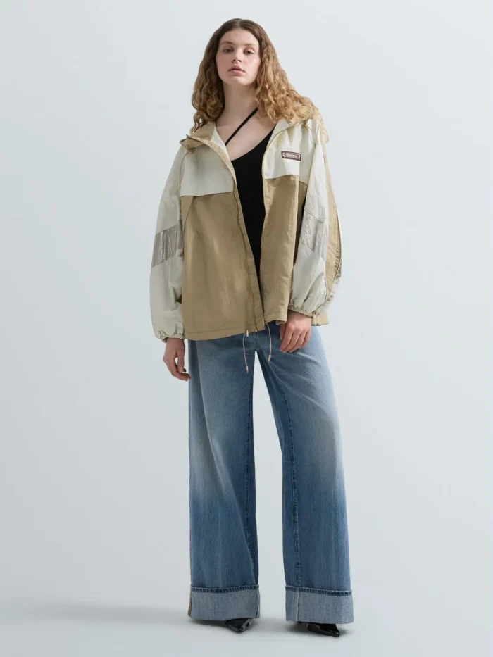 Oversize-lõikega jope, valmistatud crinkle-efektiga nailonist. Mudelit iseloomustavad eri värvi detailid. Jopel on kapuuts ja reguleeritav alläär pingutusnööriga, elastsed varrukaotsad ning tõmblukk-kinnitus. Disaini täiendab rinnal kontrastne Replay’ silt.