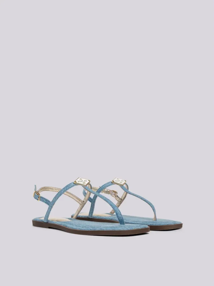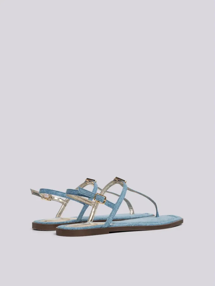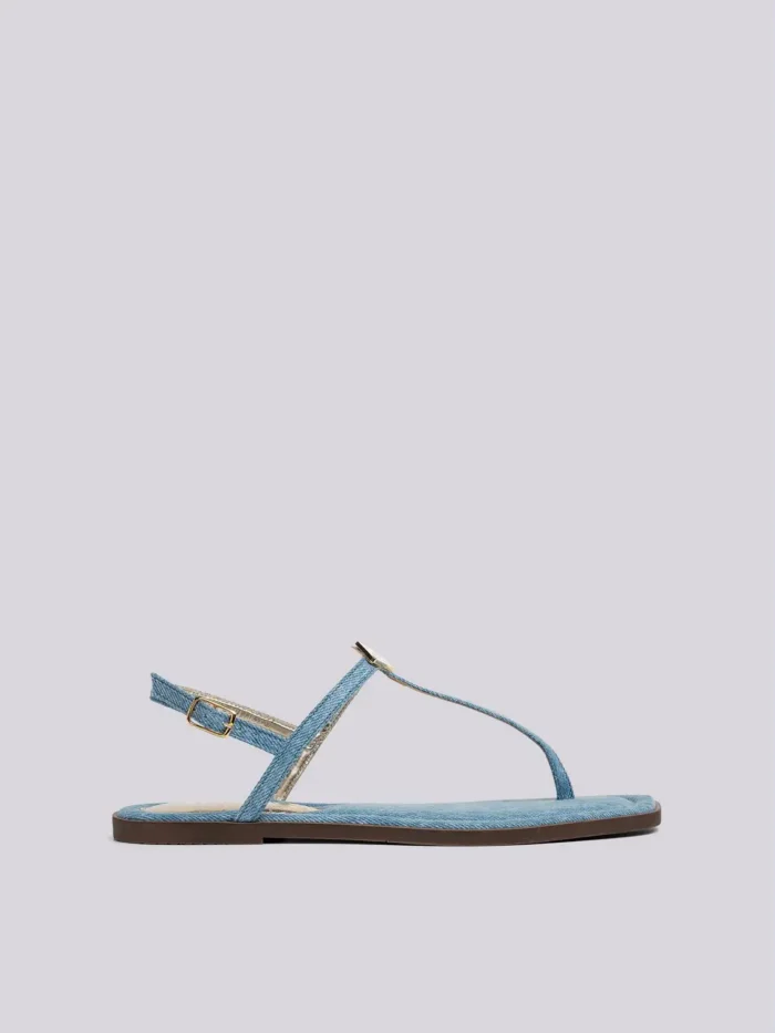Kandilise ninaga May Denim string-sandaalid, millel on minimalistlik teksariidest pealispind, mida kaunistab meie ikooniline metallist teemantlogo. Lameda tallaga mudelit täiendab reguleeritava pandlaga pahkluupael.