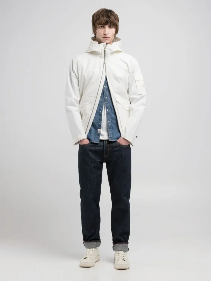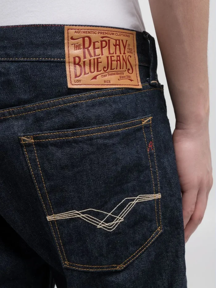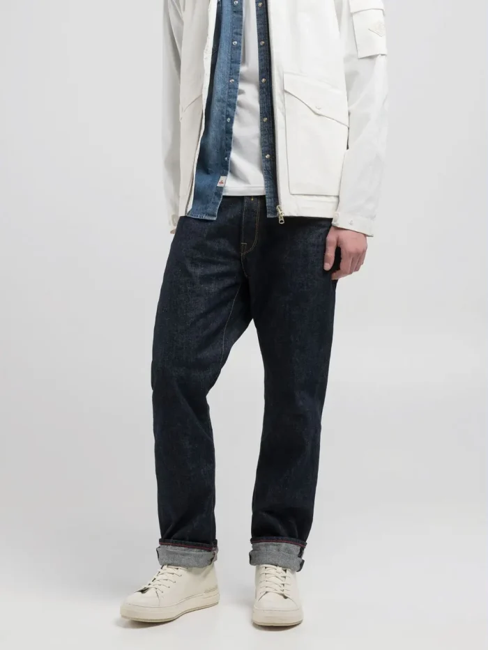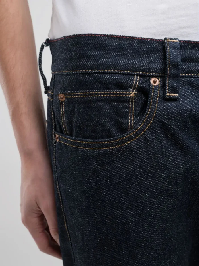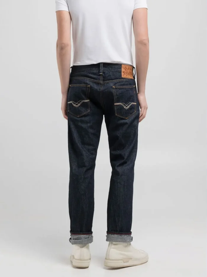 Teksad, millel on tavaline tõus ja sirge sääreosa, mis on avara ja mugava istuvusega. See viie taskuga tükk on valmistatud 12 untsi taaskasutatud puuvillasest sügavast indigoteksariidest, mida on tume loputatud ja lõplikult kuivatatud. Erilise Cornely tikandiga tehtud ikoonilised kajakate tiivaõmblused on tagataskutel, millest üks on viimistletud R-tikandiga, samas kui ühes esitaskus on väike kohandatud sisestus. Nende meesteteksade viimistleb tagaküljel olev kaubamärgiga silt. Nööpidega kinnitus.