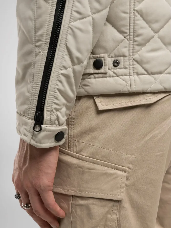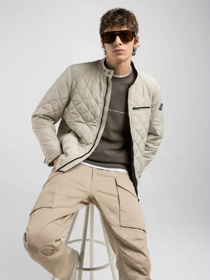 Biker jakk teemanttepiga. Tavalise istuvusega rõivast viimistlevad pehmed õmblused õlgadel ja varrukatel. Toodet täiustavad lukuga taskud ja rombikujuline logo varrukal. Täielik tõmblukuga kinnitus topelt trukkidega krael. 100%POLYESTER;