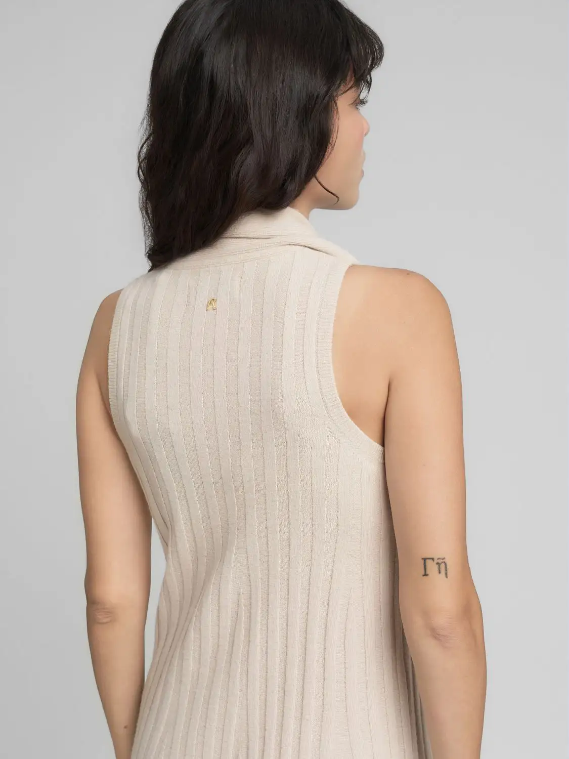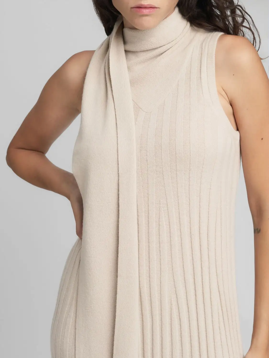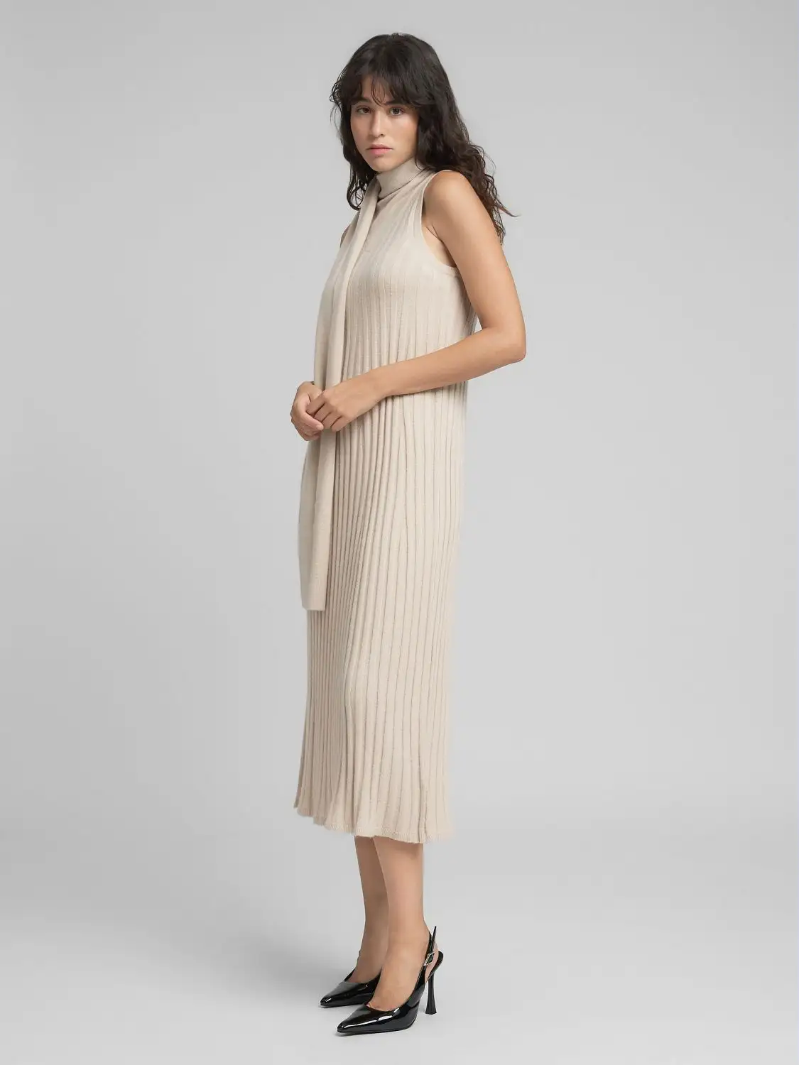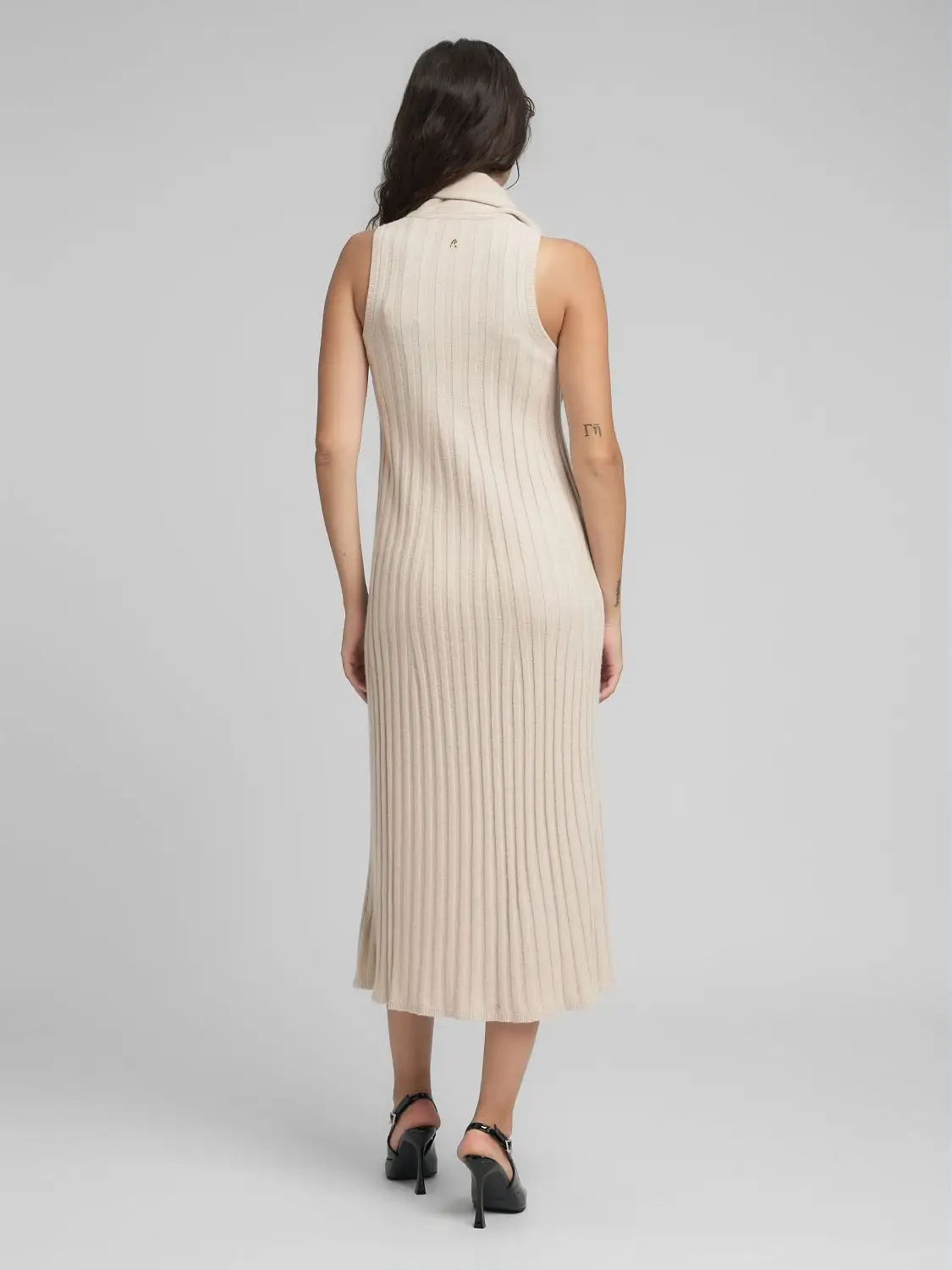 Varrukateta, tavalise lõikega midi kleit, mis on valmistatud villasegust ja millel on lamedad soonikud. Kleidi viimistleb iseloomulik kaelus, mis jätkub sobiva salliga, ja ikooniline R-detail seljal, mis on Replay kaubamärgile iseloomulik detail.