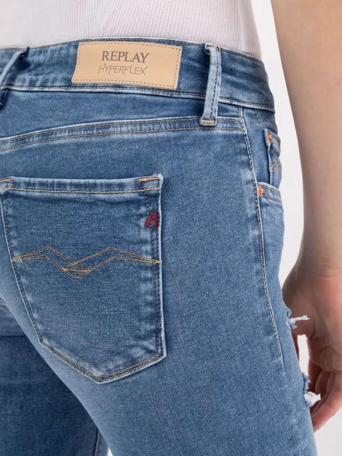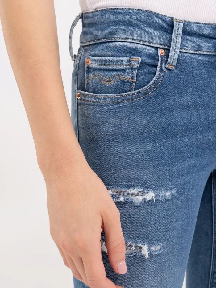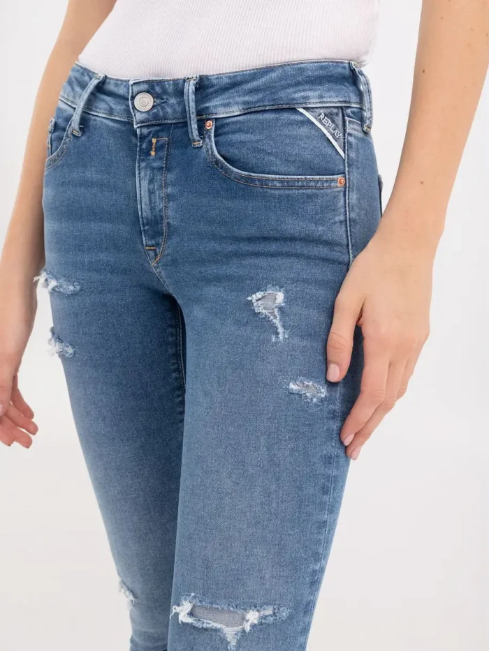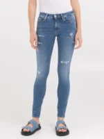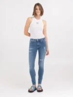 Skinny fit teksad tavalise vöökoha ja kitsa säärega. Rõivas on valmistatud 10,5 untsi sinisest elastsest puuvillasest teksast, mille keskmine sinine pesutoon annab vintage välimuse. Pükse täiustavad tõmblukk ja nööpkärb.
