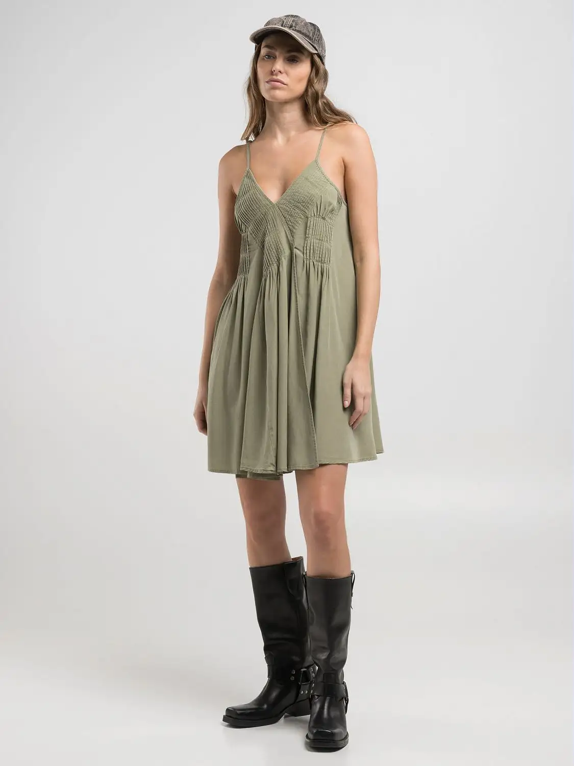 Minikleit lahedast ühevärvilisest linasest lüotselli segust. Sellel disainil on sügav V-kaelus, volditud keha esi- ja tagaküljel ning õhukesed reguleeritavad rihmad. Meie ikooniline R-neet tagaküljel lisab tükile viimase lihvi