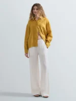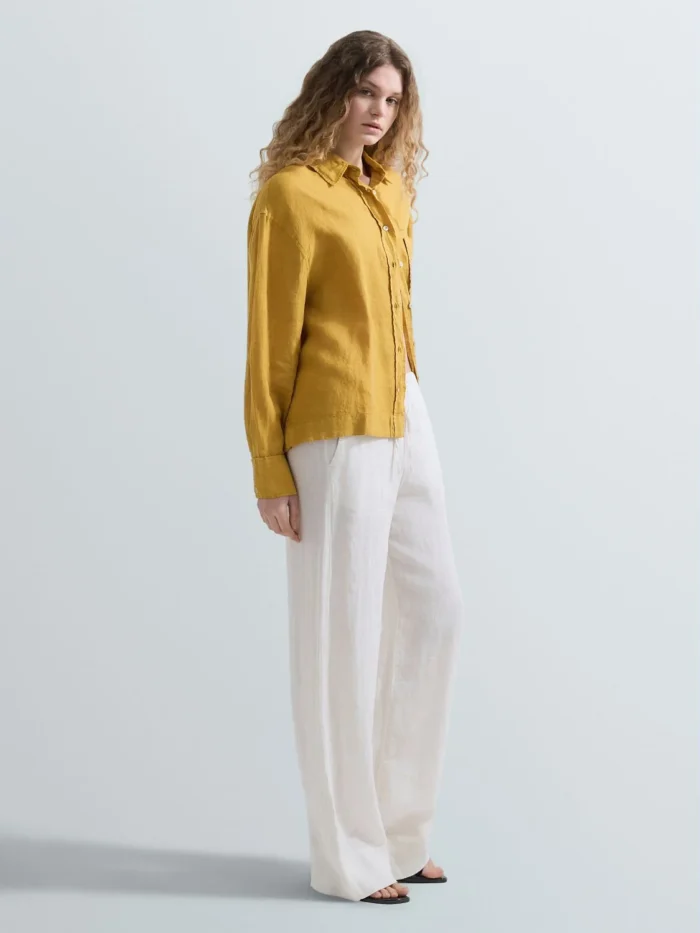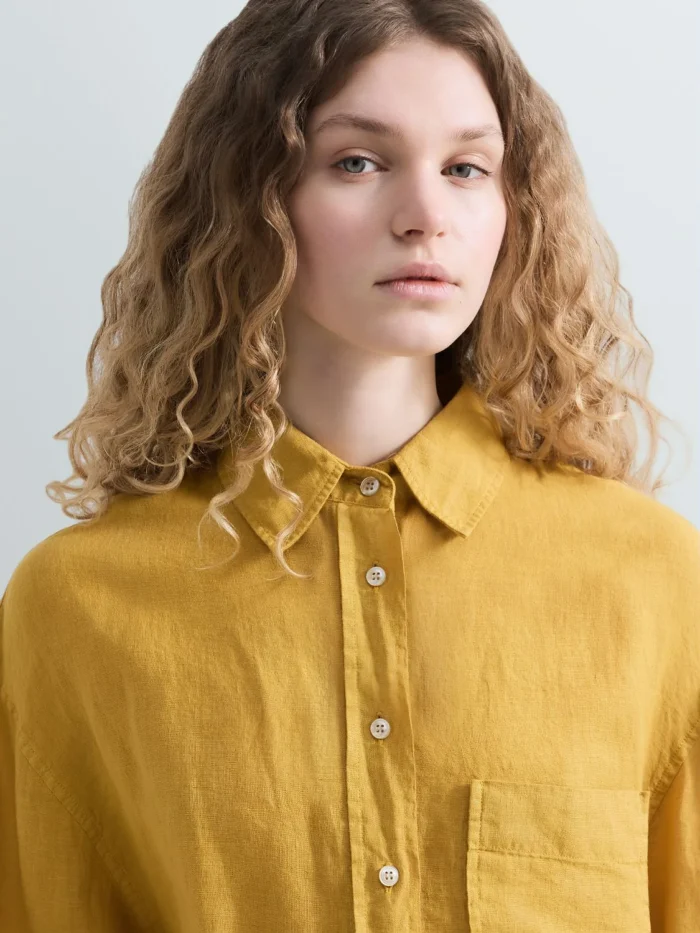 Oversize-lõikega särk, mis on valmistatud linasest kangast. Pikkade varrukatega mudelil on langenud õlajoon, praktiline pealeõmmeldud rinnatasku ja esikinnis nööpidega. Disaini iseloomustavad elegantsed küljeõmbluste lõhikud ning nööpidega mansetid.