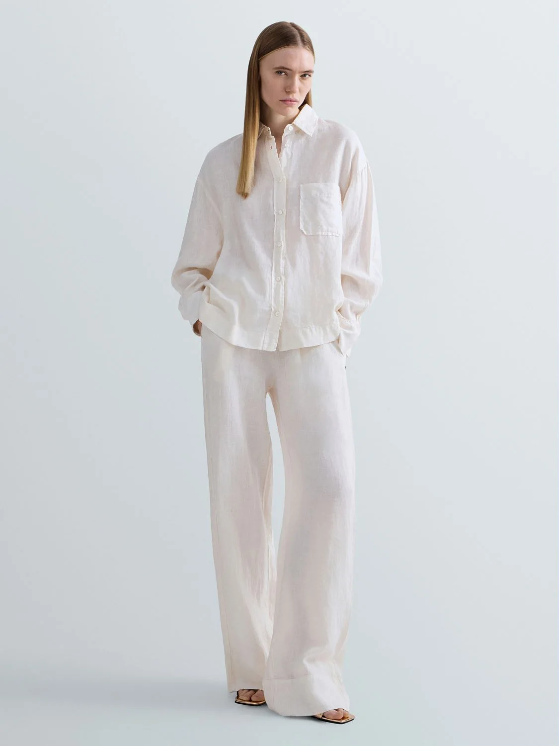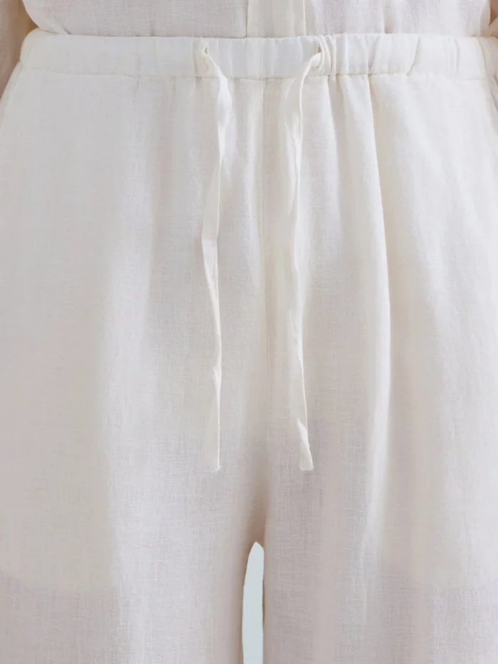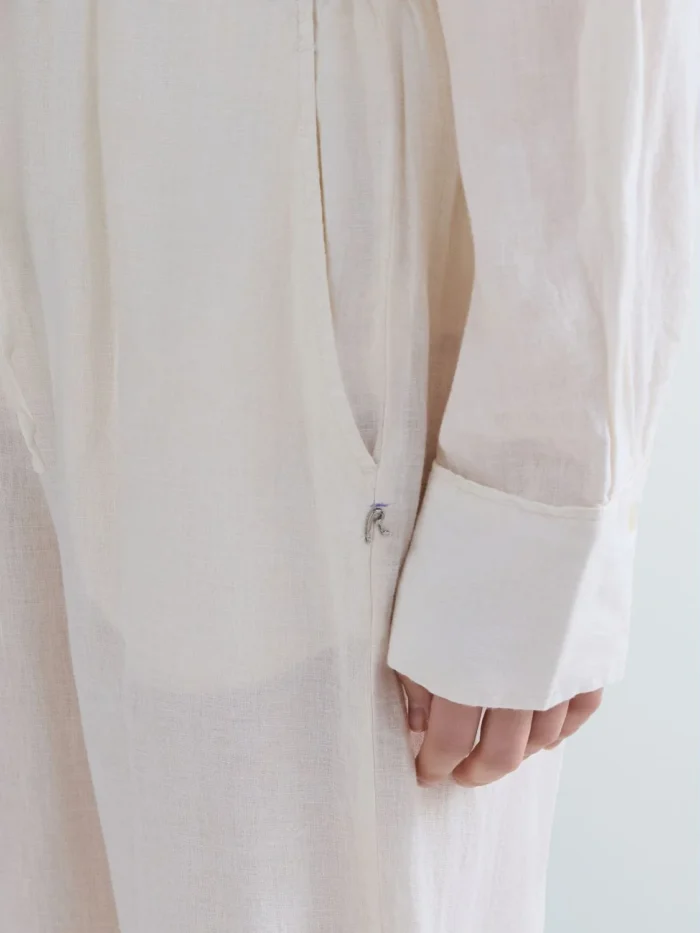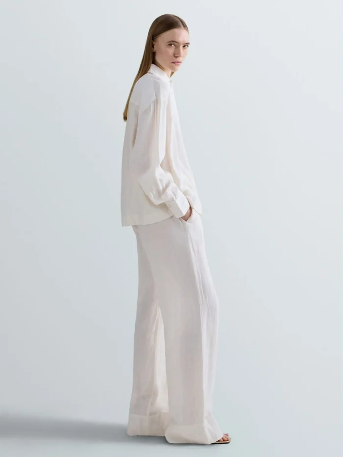 Pidžaamastiilis püksid, valmistatud puhtast linast. Mudelil on elastne vöökoht, mida saab reguleerida paelaga, ning kaks mugavat küljetaskut. Küljel on viimistluseks ikooniline metallist R-detail.