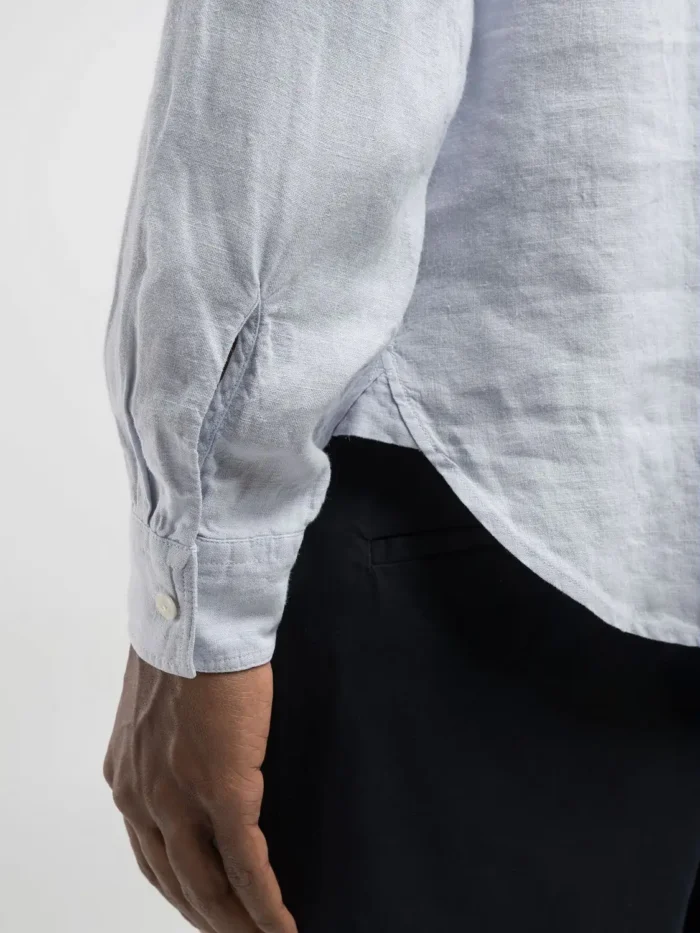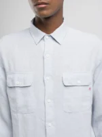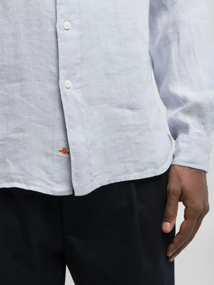 Puhta ja mitmekülgse disainiga tavalise istmega särk puhtast riidevärviga linasest. Sellel pikkade varrukatega tükil on ümar serv ja kaks nööbitava klapiga rinnataskut, millest ühel on ikooniline tikitud R, mis on tunnus Replay detail. Ees nööbiga kinnitus.