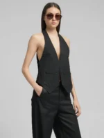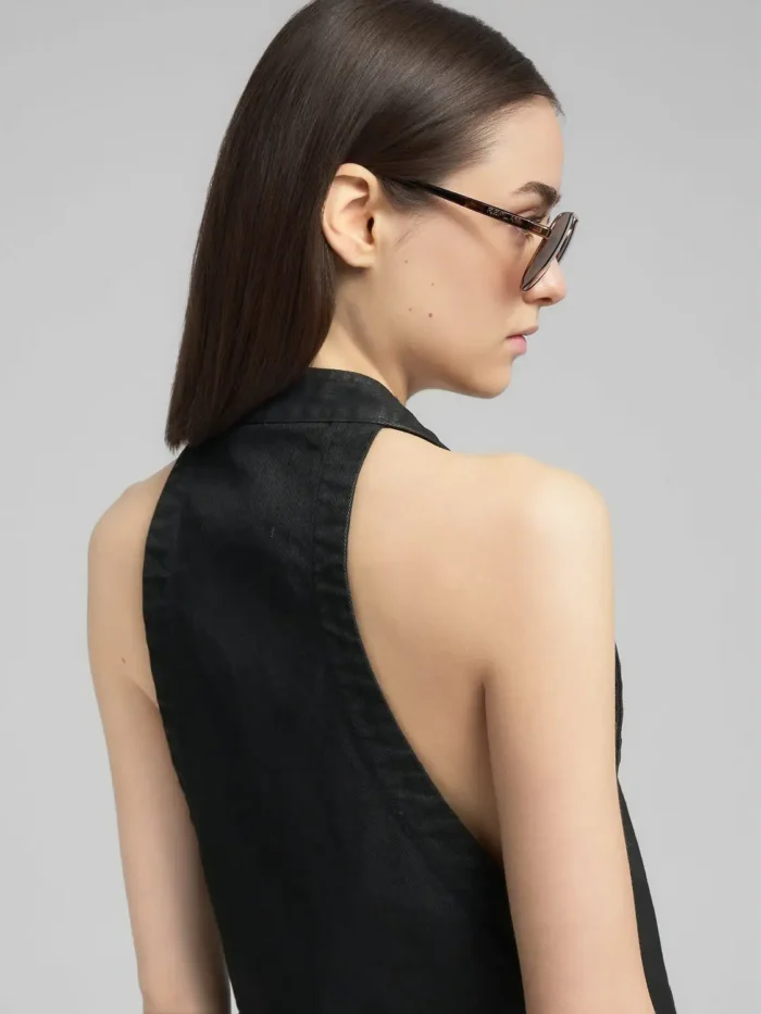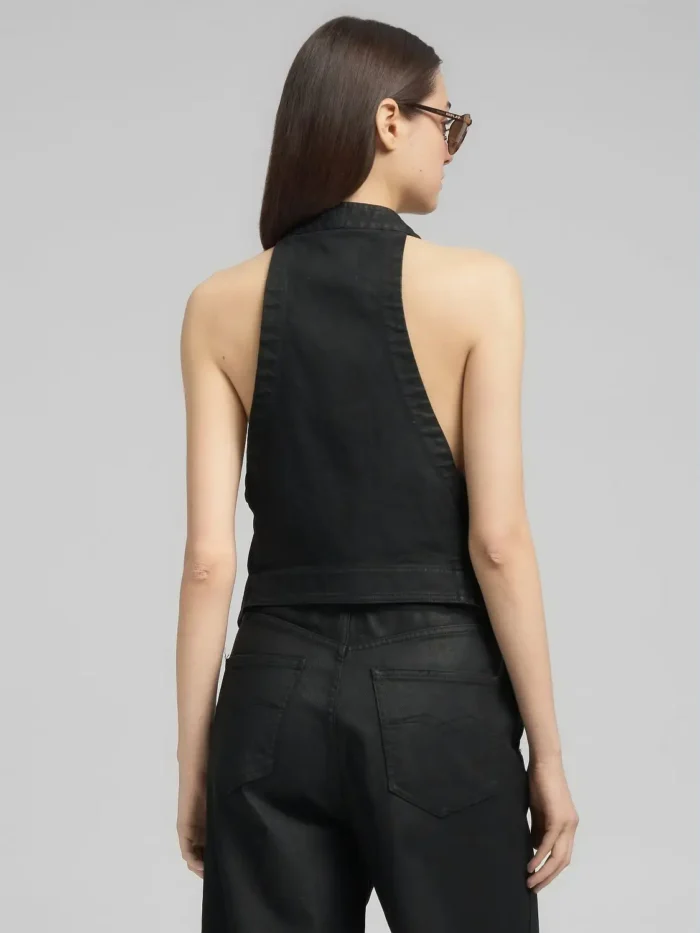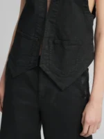 Lühike, tavalise lõikega vest, mis on valmistatud 11 untsi mustast puuvillasest mugavast teksariidest ja värvitud musta värviga. Vest on topeltpunktiga alläärega, kahe pealeõmmeldud esitaskuga ja halterkaelusega, mis lõpeb sügava V-kaelusega.