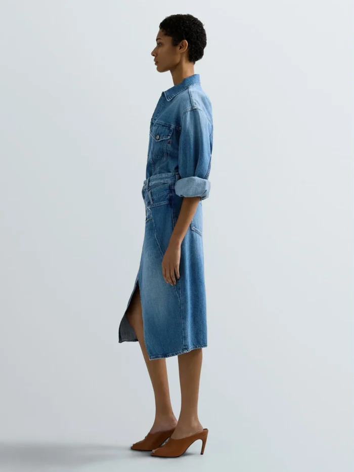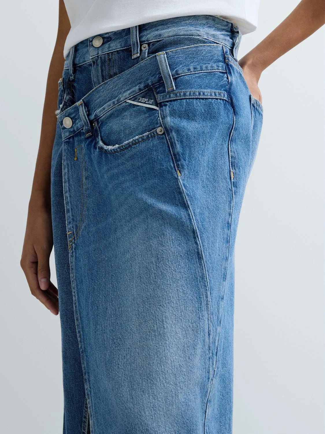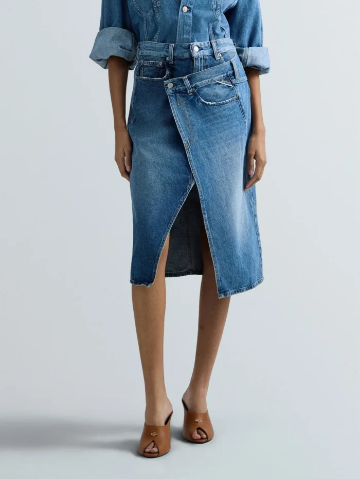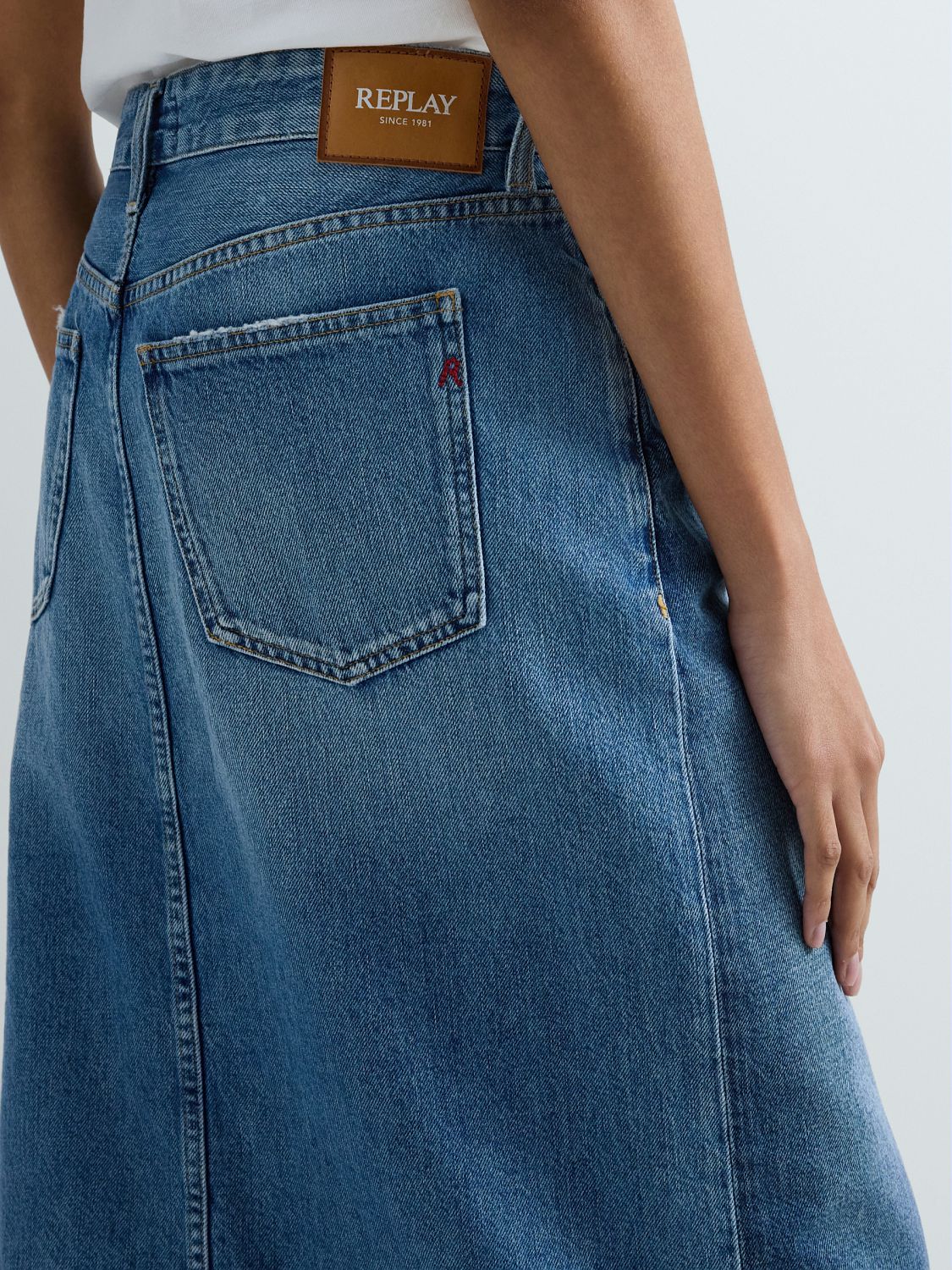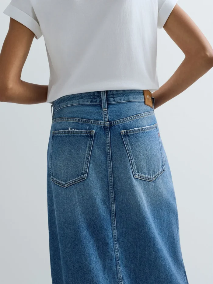 Midi-pikkuses seelik on valmistatud 12-untsisest puuvillasest denimkangast, mis on osaliselt taaskasutatud. Kangas on läbinud keskkonnasõbraliku ensümaatilise stone wash pesu sünteetilise pimsskivi ja bio-kummiga. Lõppviimistlus annab materjalile kulunud (“used”) efekti.