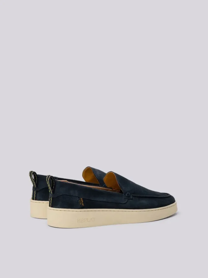 Frank M loafers, mida iseloomustab ühevärvilisest pehmest seemisnahast pealispind. Taga aaspael. Paks tald, mille küljel on reljeefne logo.