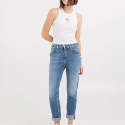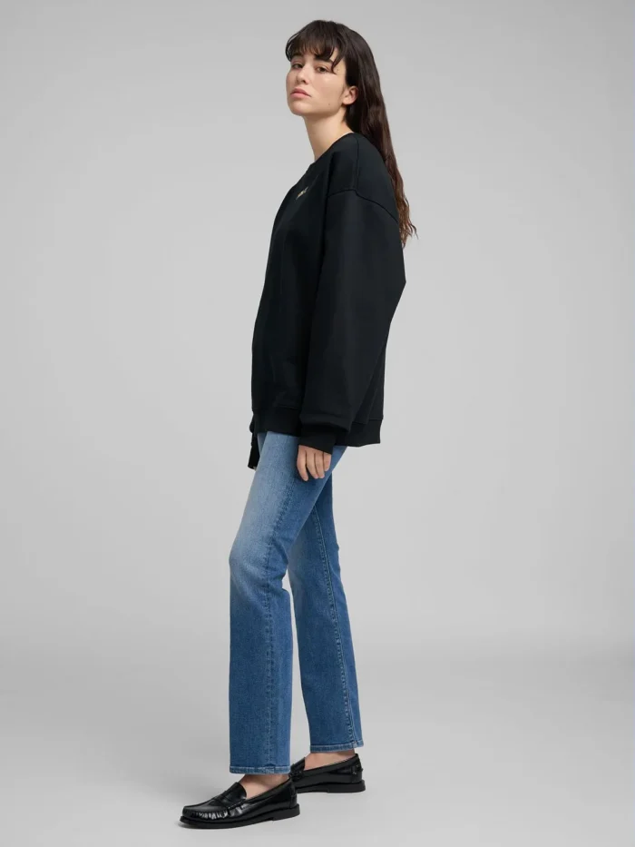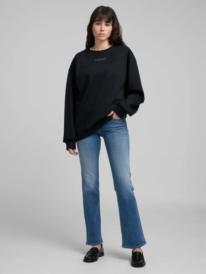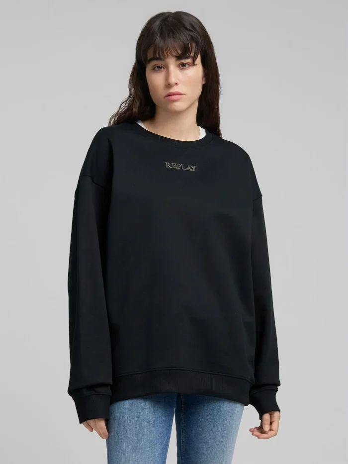 Ülesuuruses (oversized) ümmarguse kaelusega dressipluus, valmistatud pehmest puuvillasest froteekangast. Mudelil on pikad varrukad langetatud õlajoonega ning viimistletud soonikkoes kaeluse, varrukaotste ja alläärega. Ees on kaunistuseks ikooniline reljeefne kullast Replay kiri.