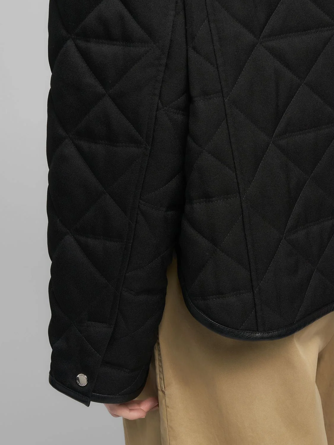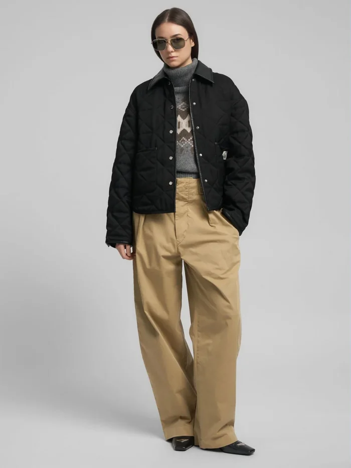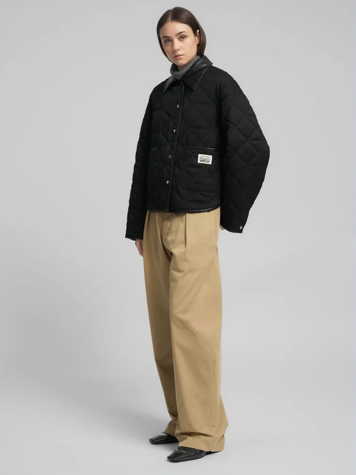 Lühem, relaxed-fit lõikes tepitud ja polsterdatud jope rombimustrilise tepinguõmblusega. Mudelil on kontrastne teravatipuline krae, ümar alläär ning kaks pealeõmmeldud esitaskut, millest ühte kaunistab etikett brändi peakorteri kujutise ja Replay kirjalogoga. Naistele mõeldud jopel on ees trukk-kinnitus, samuti trukid varrukaotstel, ning kontrastsed ääristused välisservadel.