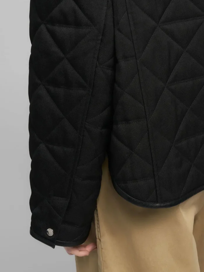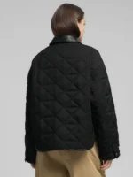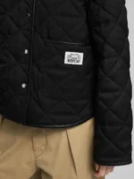 Avara lõikega tepitud lühike jope. Teemantmustriga õmblustega. Mudelil on kontrastne punktkrae, ümar alläär ja kaks esiküljel olevat taskut, millest ühel on silt, mis kujutab brändi ikoonilist peakorterit ja Replay kirja. See naiste jakk on varustatud eesmise trukkkinnitusega, mis on olemas ka kätiste juures, ja kontrastsete välisservadega.