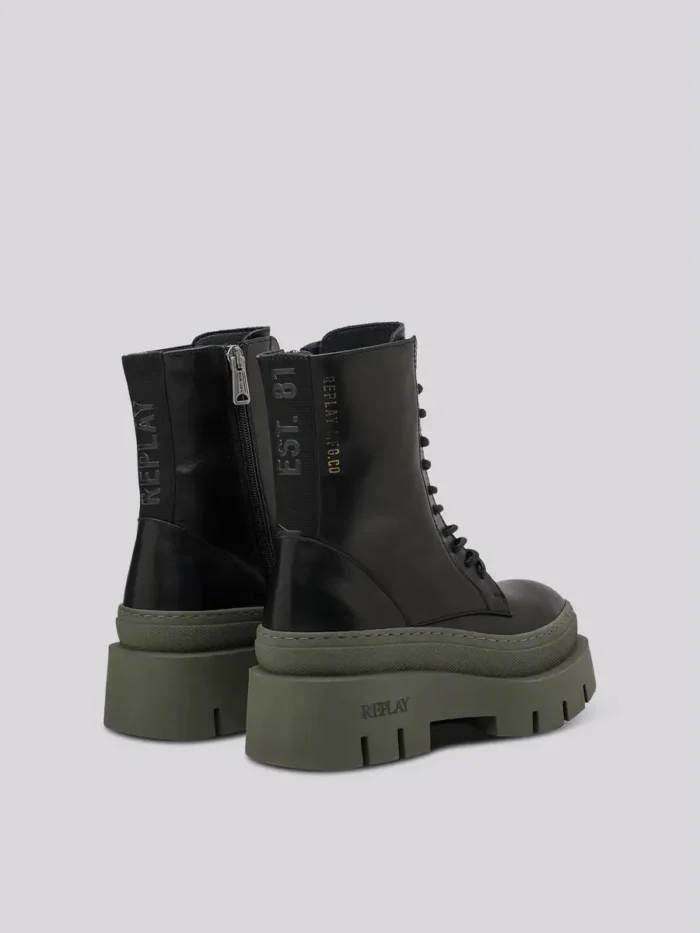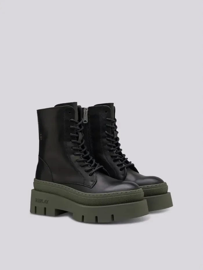 Nathalie Lace nöörsaapad paeltega, mida iseloomustab ühevärvilisest siledast nahast pealispind. Kohandatud silt keelel ja logo küljel. 4 cm kõrgune paks konts ja tank tald.