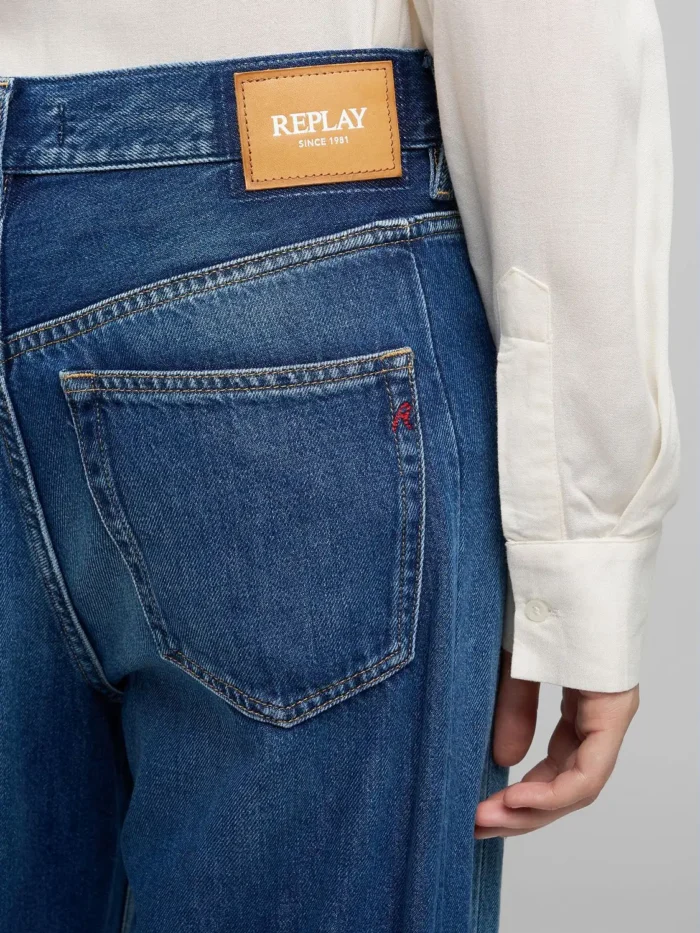Kottis lõikega teksad madala vöökoha ja laia, lõdva säärega. Need teksad on valmistatud 10,5-untsisest puuvilla/lüotselli segust, keskmise pesuga ning neil on käsitsi vurrutatud ja kraabitud mustrid, mis loovad kulumispiirkondadele kontrasti. See viie taskuga teksa on viimistletud meie ikoonilise R-tikandiga ühel tagataskul ja logoga sildiga tagaküljel, mis on Replay iseloomulik detail. Luku ja nööbiga kinnitus.