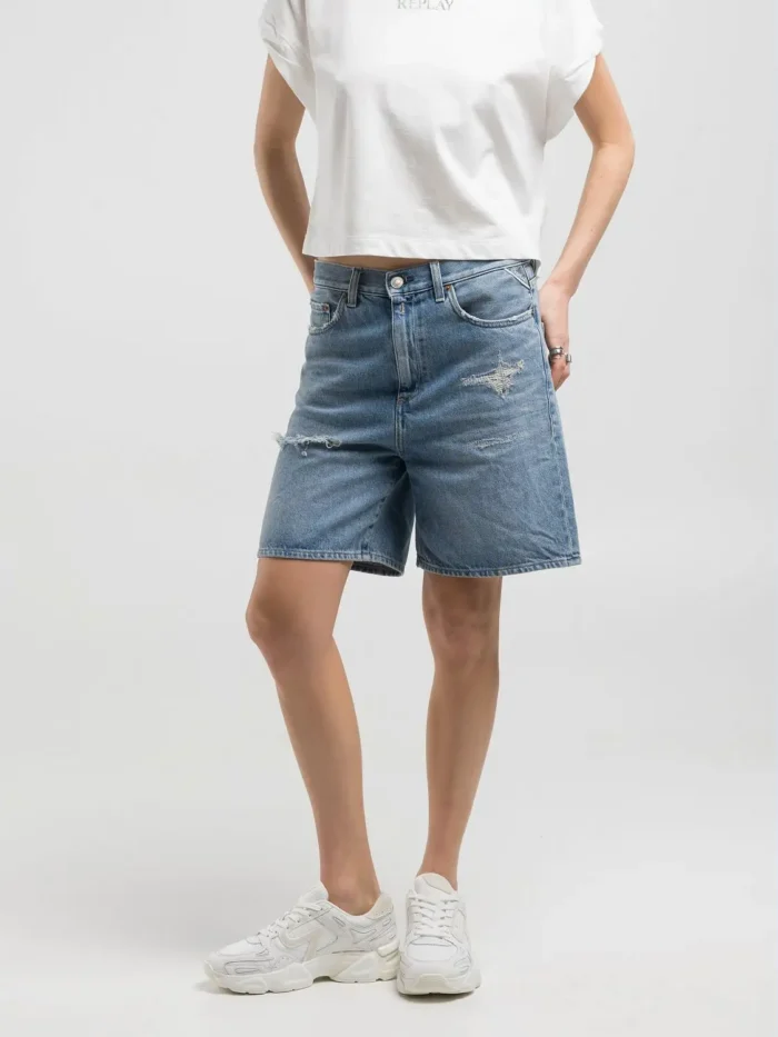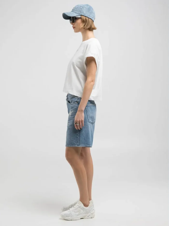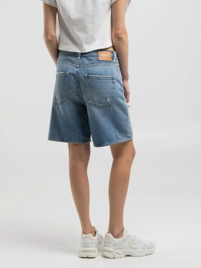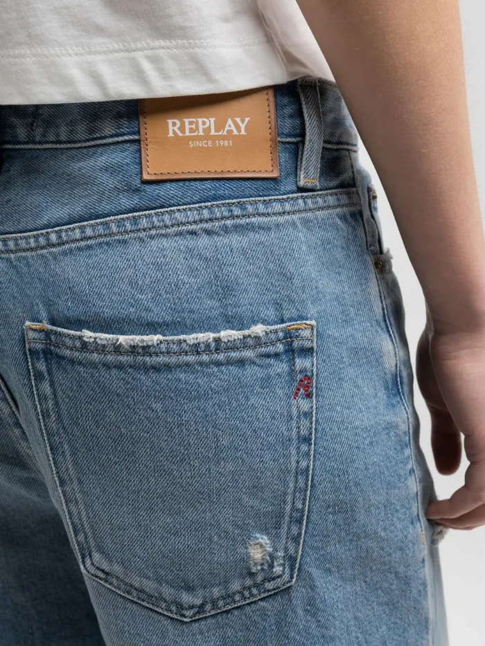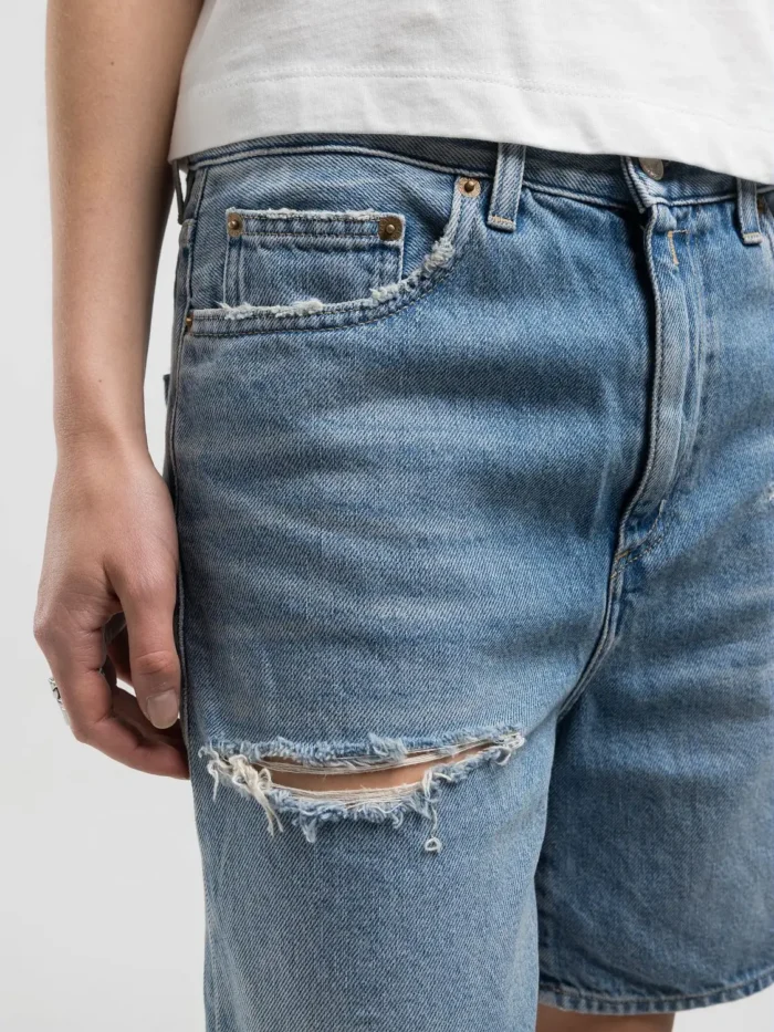 Vabaaja lõikega lühikesed püksid 11-untsisest lüotsell-/puuvillast indigosinist teksariidest, mis on pestud keskmise karedusega kiviga, pestud valgendiga ja viimistletud pehmendajaga. Sellel viie taskuga püksidel on käsitsi tehtud vurrud ja kriimud ning suured lapitud ja parandatud rebendid, mis loovad kulumiskohtadele värvikontrasti, samas kui kerge värvitöötlus vannis annab teksariidele vananenud ilme. Ühel kahest tagataskust on ikooniline R-tikand, samas kui väike eritellimusel valmistatud vahetükk viimistleb ühte esitaskut. Luku ja nööbiga kinnitus.
