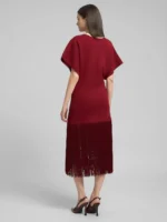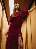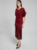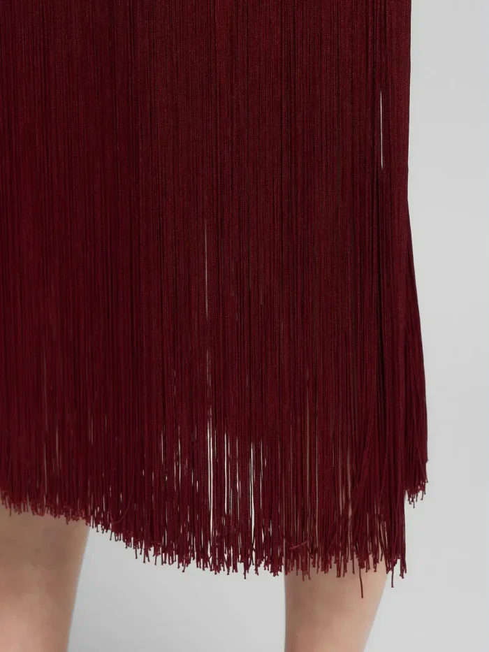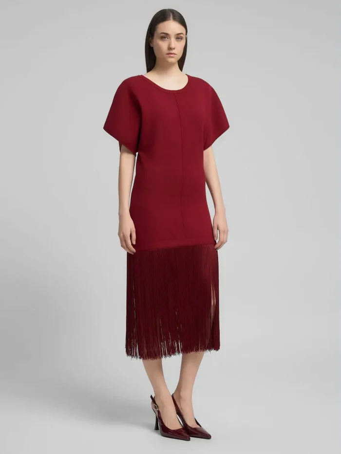 Viskoosisegust kitsa lõikega midikleit. Pikk narmastega alläär lisab kandmisel liikumist. See ümara kaelusega kleit on laiade lühikeste varrukatega, ees ja taga on vertikaalne õmblus ning seljal on meie ikooniline metallikvärvi R-detail. 62%VISKOOSI; 38%POLÜESTERIT