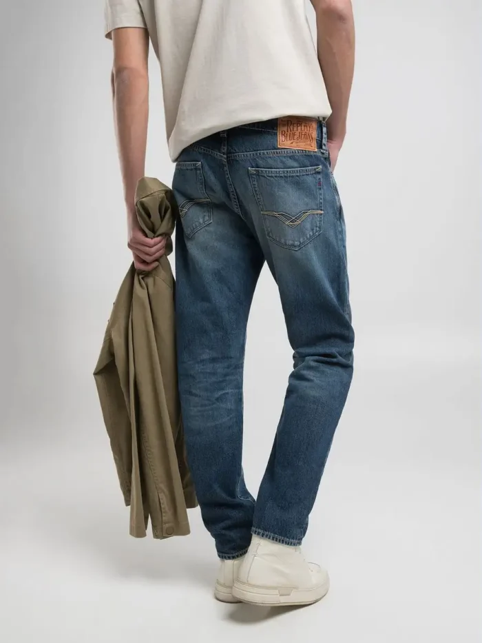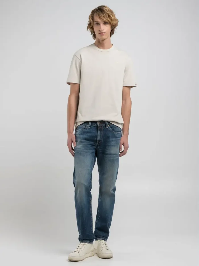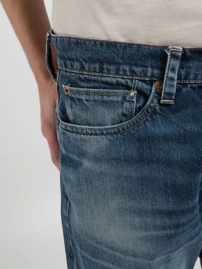 Tavalise lõikega teksad sirge säärega, laia ja mugava lõikega. See viie taskuga teksasärk on valmistatud 300 g taaskasutatud puuvillast, sügavast indigosinist teksariidest, mida on pestud tumeda loputusega ja kuivatatud rippuvalt.