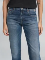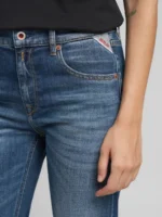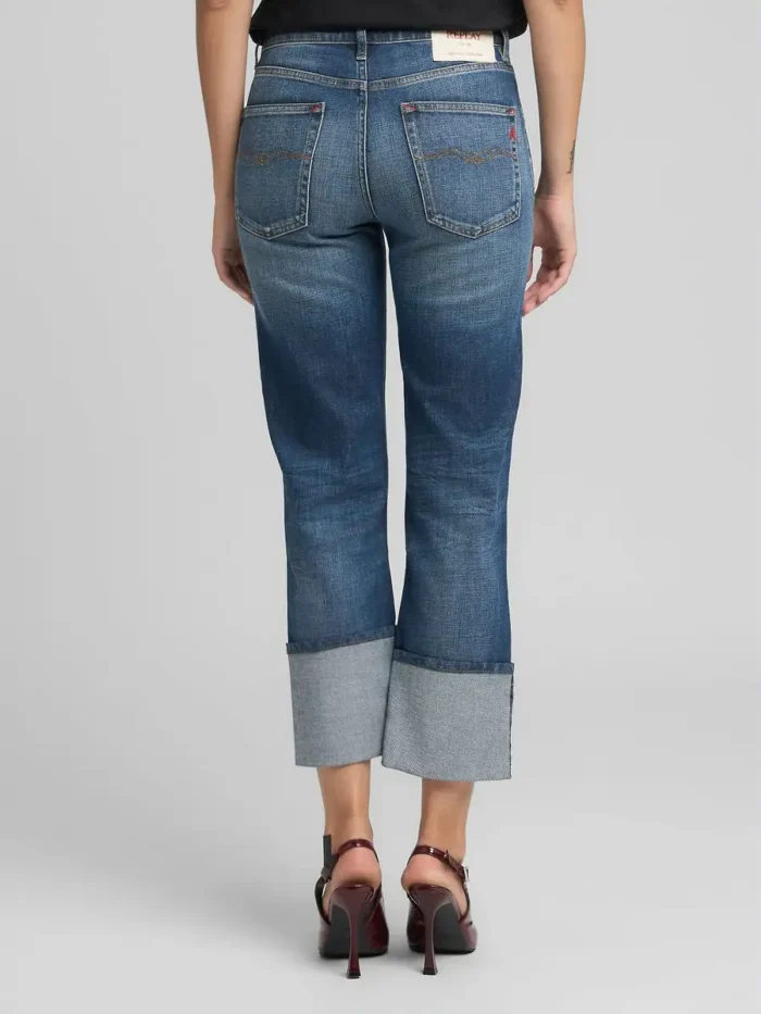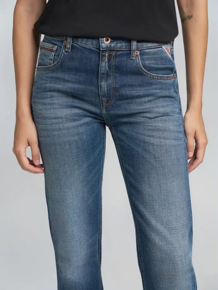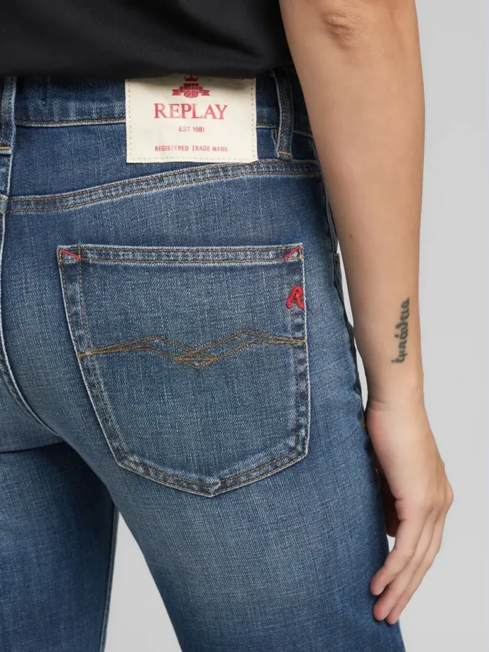 Sirge lõikega teksad madala vöökoha ja sirge säärega. See mudel on valmistatud 10-untsisest puuvillasest indigosinist mugavusteksariidest, mida on töödeldud keskmise ensümaatilise kivipesuga, kerge värvitöötlusega vannis, mis annab teksariidele kulunud ilme, ja lõplik pehmendustöötlus. See viie taskuga ese on eelnevalt vaiguga pestud 3D-efektiga ja käsitsi kriimustatud, mis loovad kulumispiirkondadele kontrasti. Tagumistel taskutel on iseloomulikud meie ikoonilised kajakatiibade õmblused ja kohustuslik R-tikand ning need on viimistletud punase õmblusega, mis on Replay signatuurvärv ja mida on näha ka viiendal taskul. Luku ja nööbiga kinnitus.