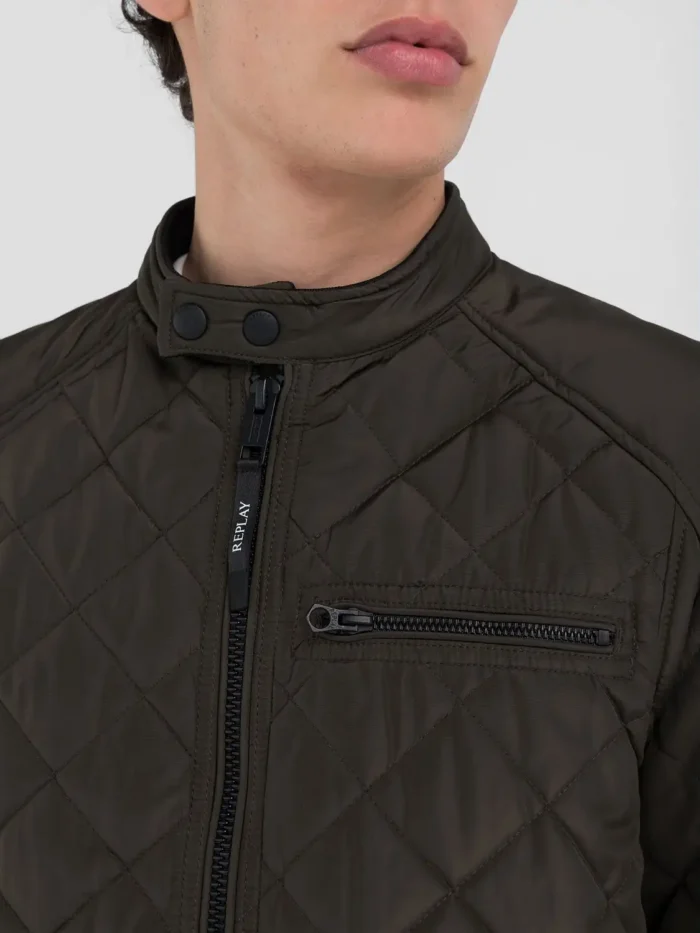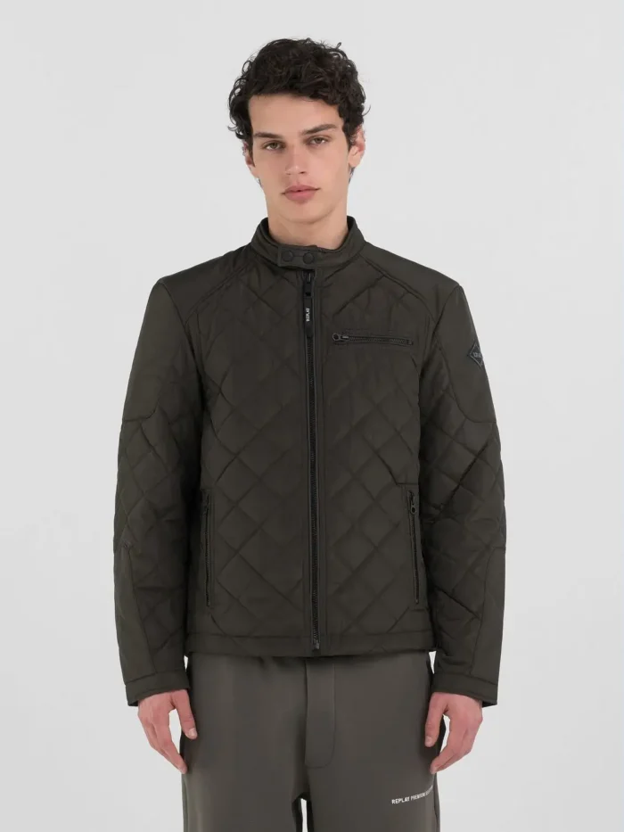 Biker jakk teemanttepiga. Tavalise istuvusega rõivast viimistlevad pehmed õmblused õlgadel ja varrukatel. Toodet täiustavad lukuga taskud ja rombikujuline logo varrukal. Täielik tõmblukuga kinnitus topelt trukkidega krael. 100%POLYESTER;