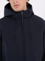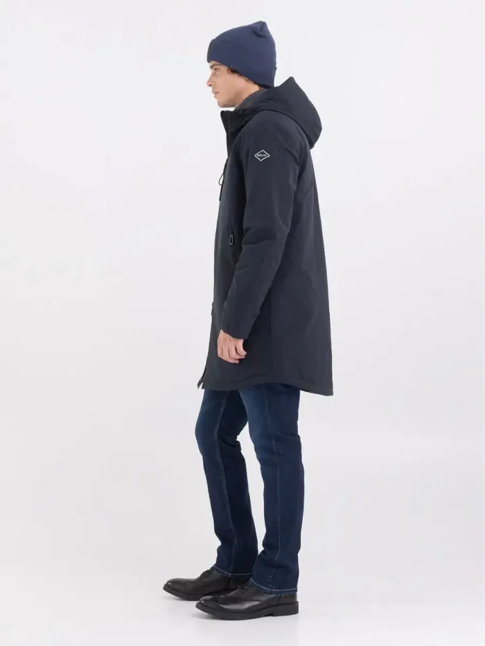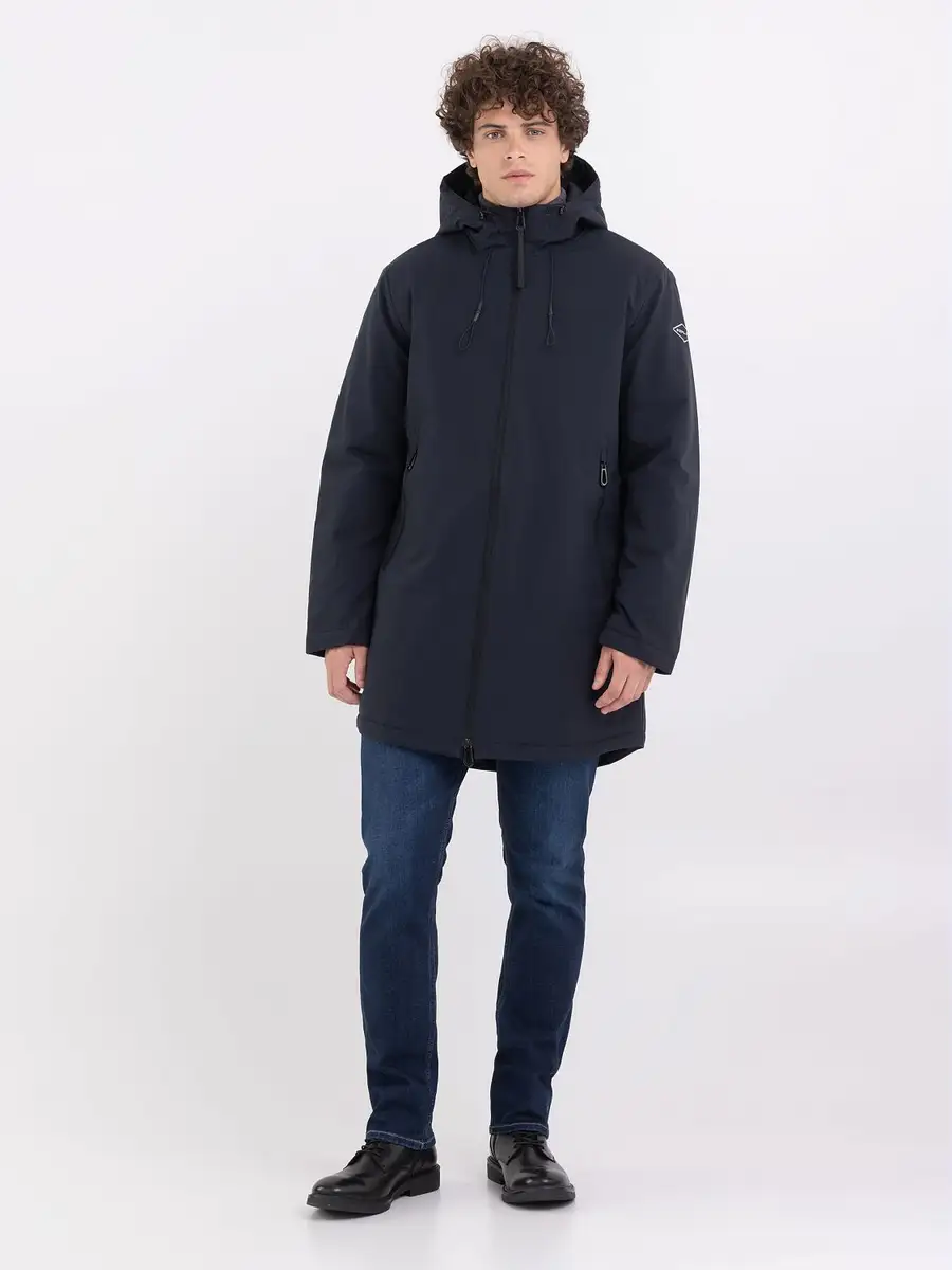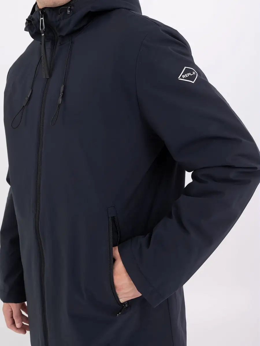 Ühevärvilisest tehnilisest nailonist valmistatud pikk jakk. Kerge sisepolsteriga rõivas on mugavalt istuv ja varustatud nööriga kapuutsiga. Toodet täiustavad kaks külgmist lukuga taskut ja rombikujuline logo varrukal. Täielik tõmblukuga kinnitus.
