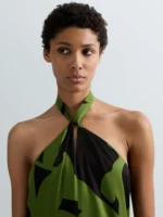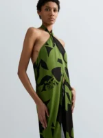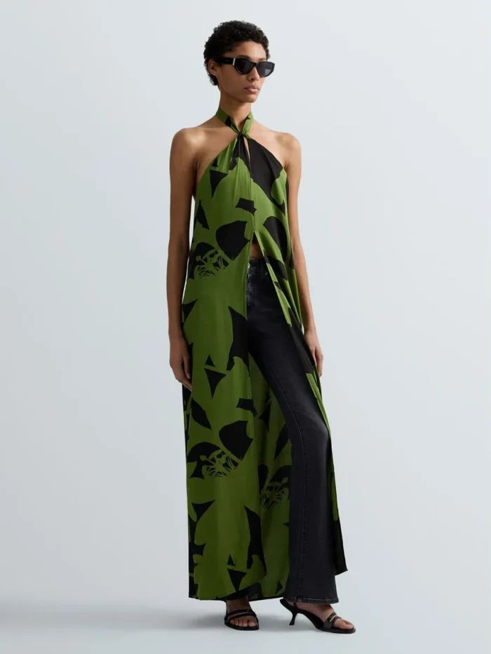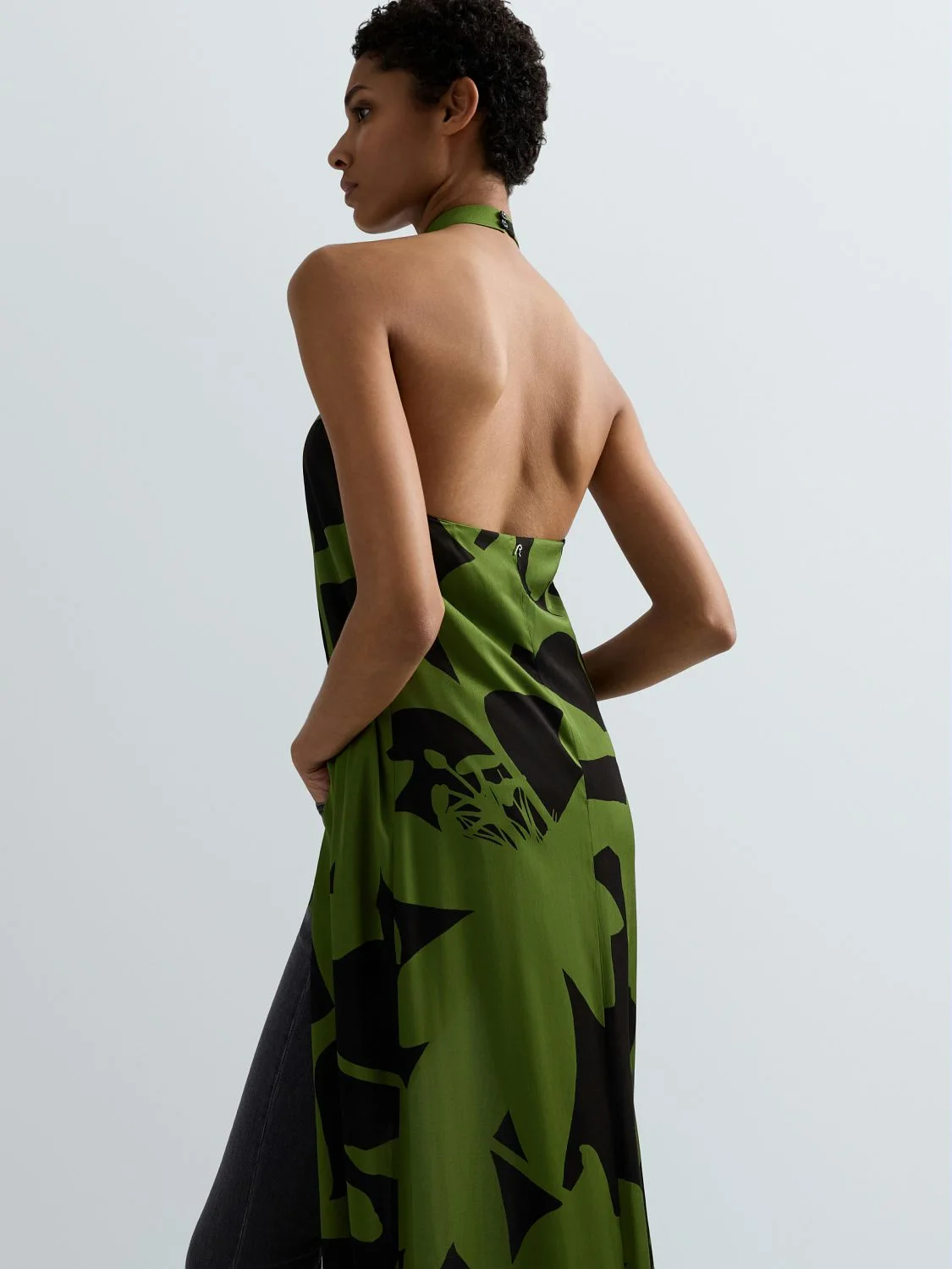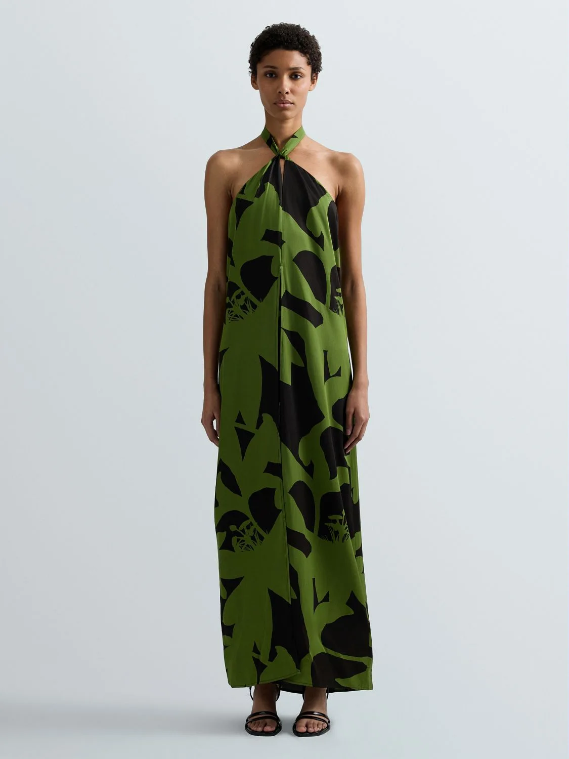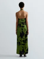 Pikk kleit pehmest viskoos-tvillkangast, millel on üle kogu pinna lilleline muster. Mudelil on ees sügav keskmine lõhik ning halterneck-kaelus väikese avausega ees ja nööpkinnitusega taga. Kleidi seljaosa jätab selja peaaegu täielikult paljaks ning seda täiendab väike R-detail – Replay’le omane tunnus.