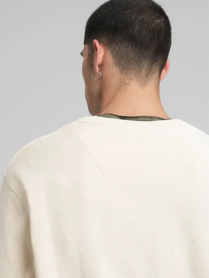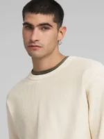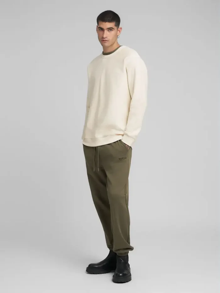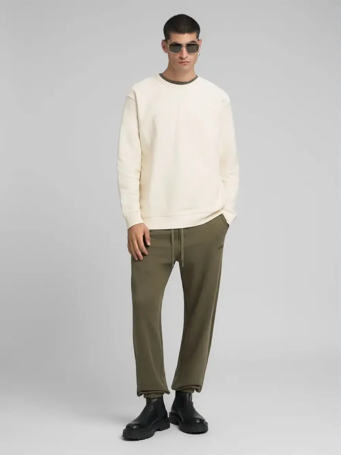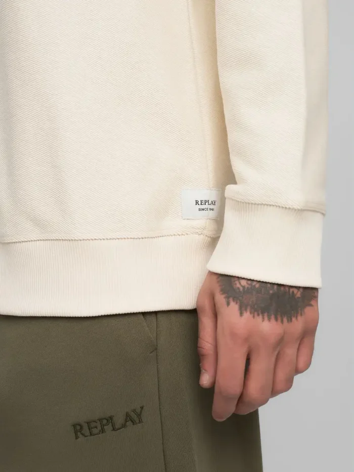 Ümara kaelusega puhtast puuvillast dressipluus diagonaalse interlock-koe mustriga. See pikkade varrukatega ja tavalise lõikega rõivas on kaetud peenikese soonikuga kaelus, kätiste ääres ja allääres. Rõivast eristab ka nähtav õmblus seljal.