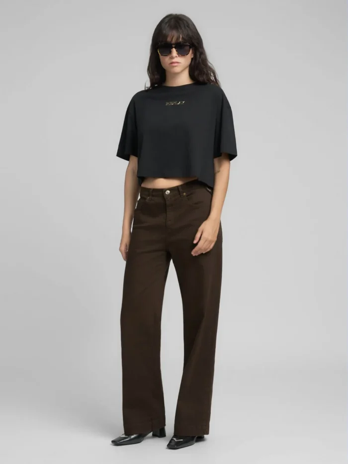 See kärbitud pikkusega ümmarguse kaelusega T-särk on oversized-lõikega ja valmistatud pehmest puuvillasest kangast. Lühikeste varrukate ja langenud õlgadega mudelit kaunistab reljeefne Replay logo rinnal keskel.