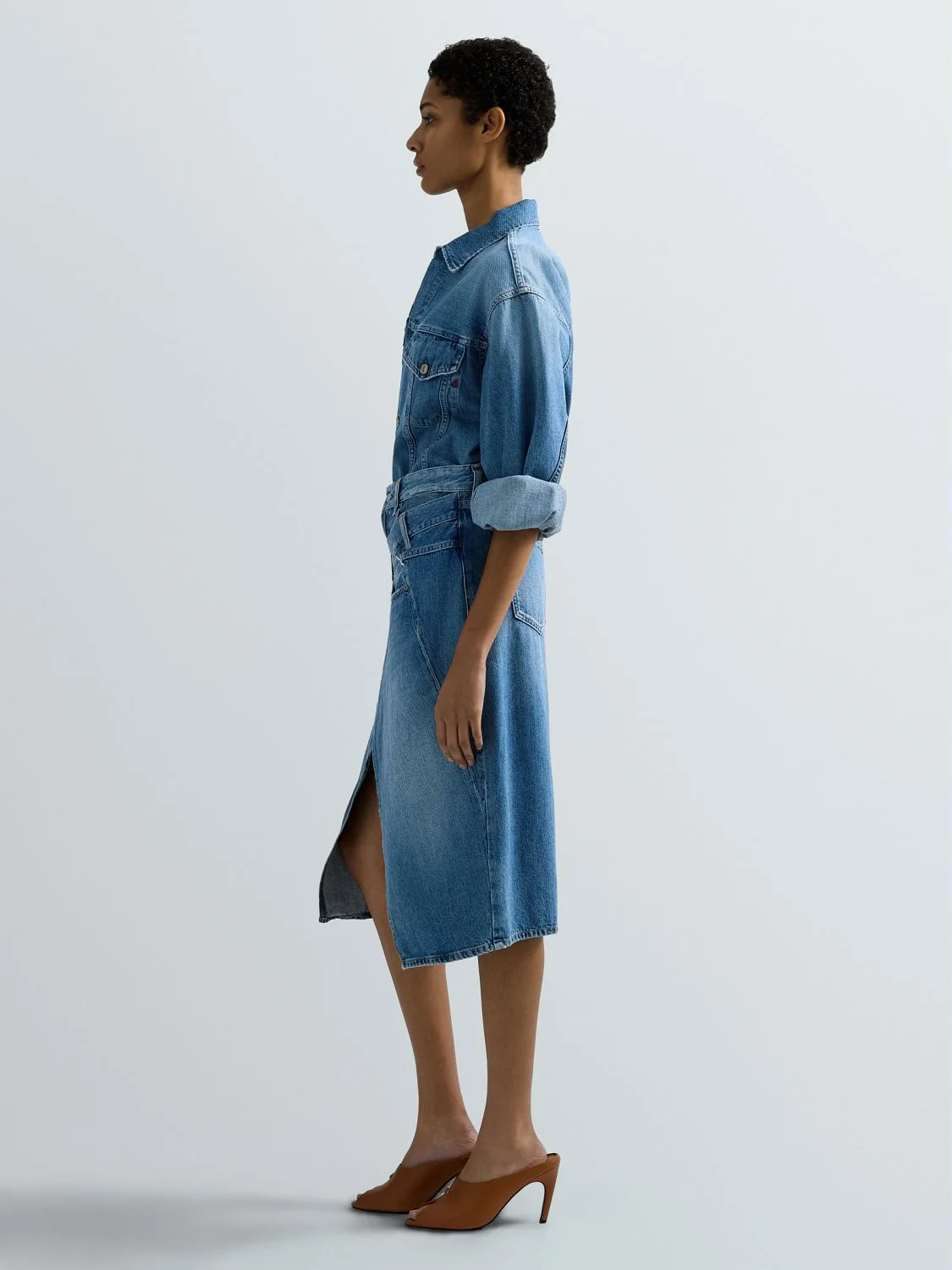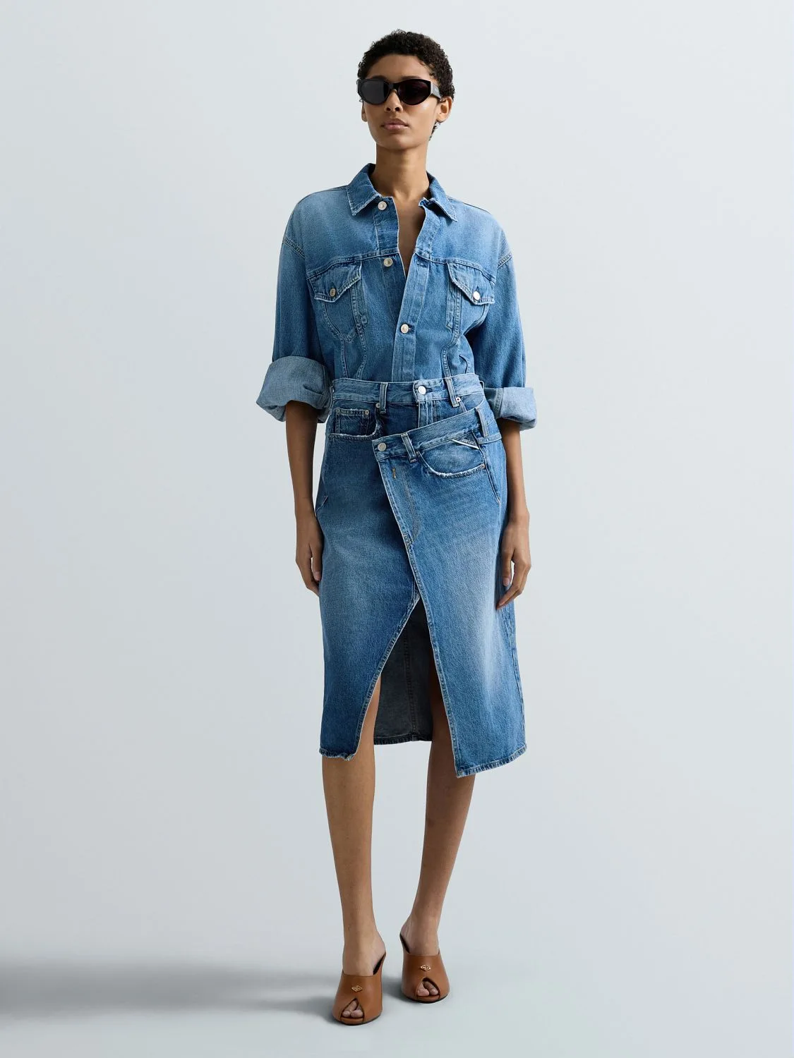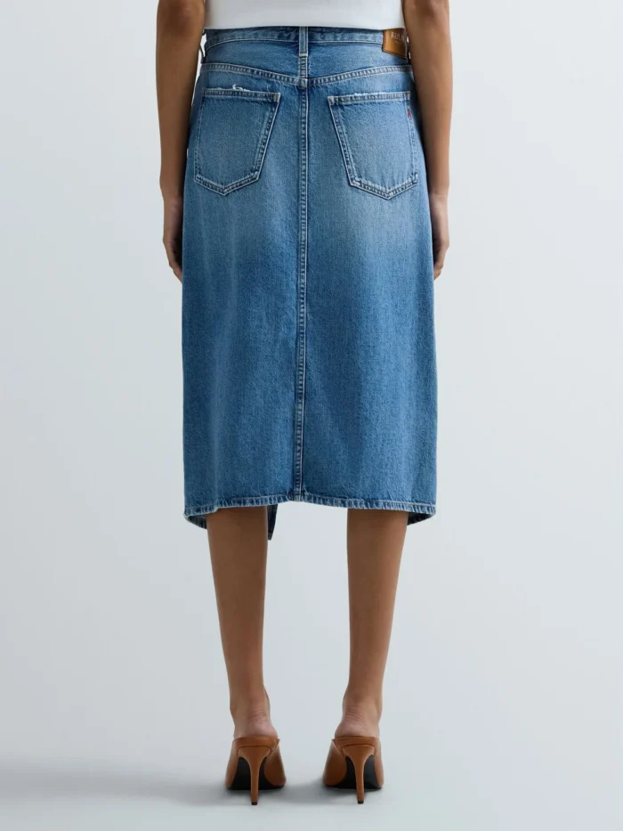 Midipikk seelik, mis on valmistatud 12 oz puuvillasest denimkangast, mis on osaliselt taaskasutatud. Kangale on tehtud ökoloogiline ensüümpesu (eco stone wash) sünteetilise pimsskivi ja bio-kummiga keskmises toonis ning lisatud lõppviimistluses määrdunud efekt, et anda materjalile kulutatud välimus.