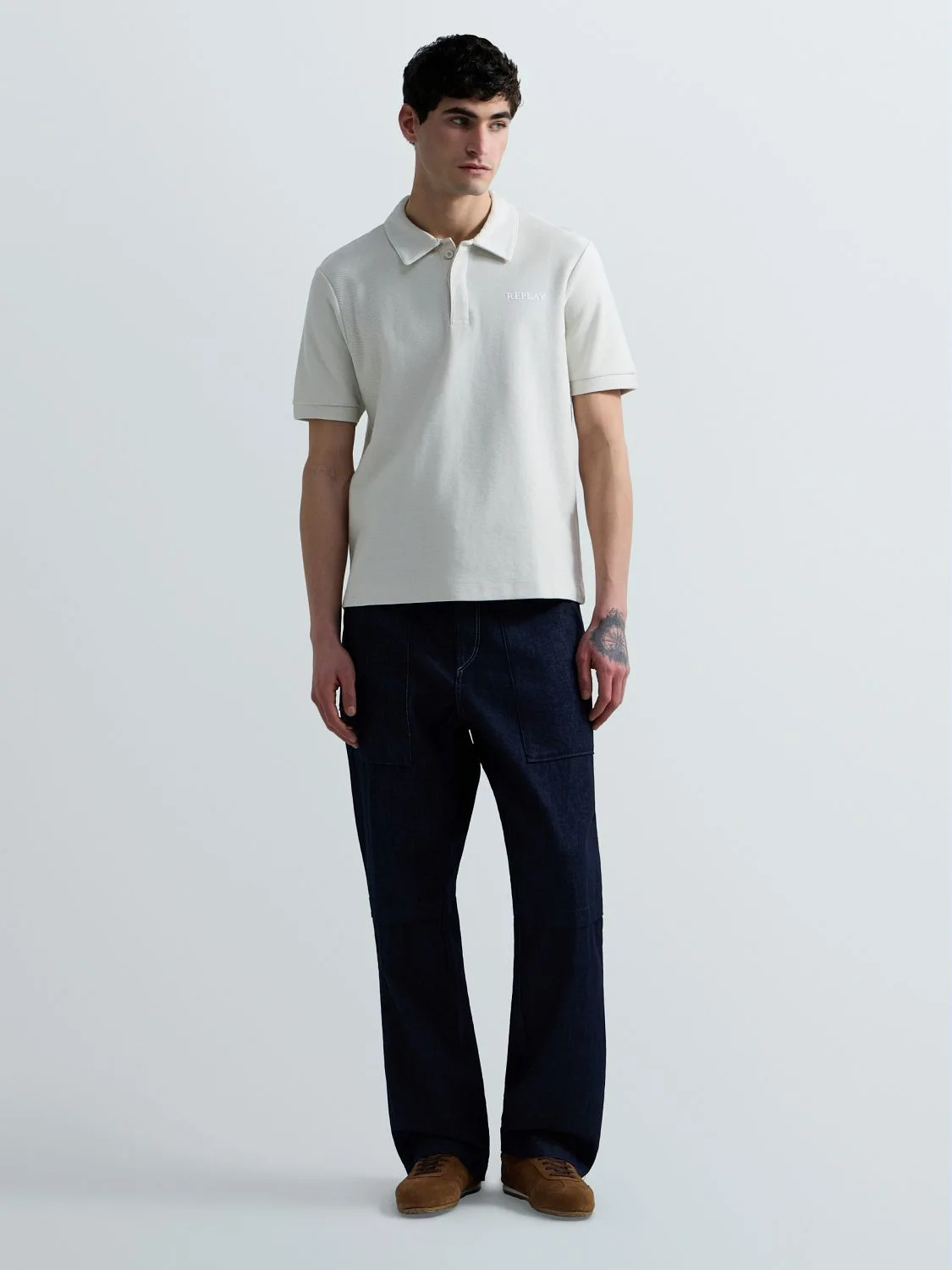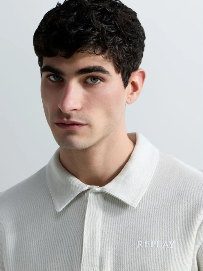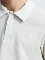 Tavalise lõikega polosärk, mis on valmistatud raskest puuvillasest jersey-kangast diagonaalse koega. Lühikeste varrukatega mudelil on klassikaline teravatipuline krae ja peidetud nööpidega nööbiliist. Rinnal on toon-toonis Replay kiri.