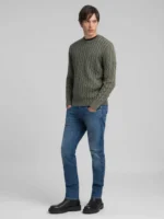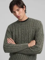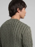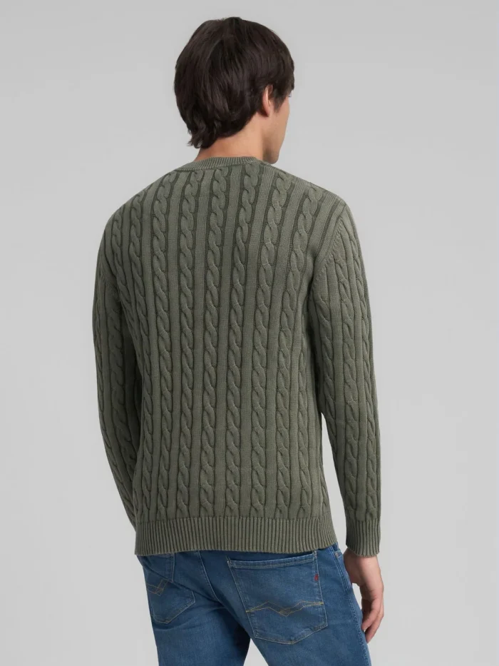 Tavalise lõikega ümara kaelusega kampsun värvitud ja ensüümpesuga puhtast puuvillast. See pikkade varrukatega ja kergelt langetatud õlgadega pluus paistab silma palmikmustriga kootud mustri ja peene soonikmustriga kaelusel, kätiste ääres ja allääres. Mudelit kaunistab meie kontrastne R-tikand rinnal.