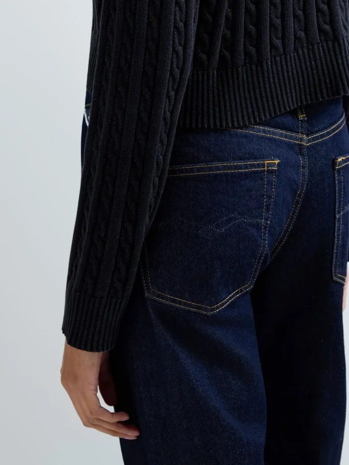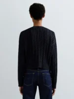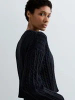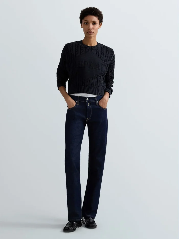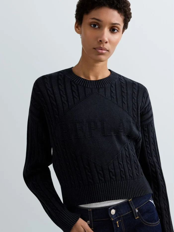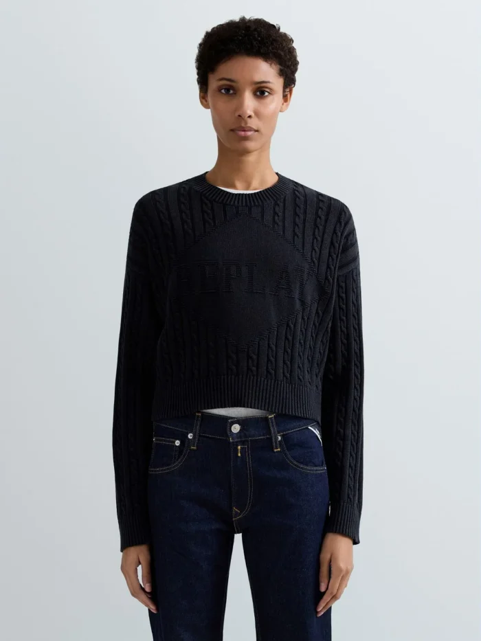Cropped-lõikega ja vaba istuvusega kampsun, valmistatud rõivavärvitud puuvillast ning töödeldud ensüümpesuga. Mudelil on pikad langetatud õlaga varrukad ning seda iseloomustab sooniku- ja palmikmuster. Ümar kaelus, varrukaotsad ja alläär on viimistletud soonikkoes. Rinnal paistab silma toon-toonis žakaarkoes rombikujuline Replay logokiri, mis väljendab Replay brändi DNA-d.