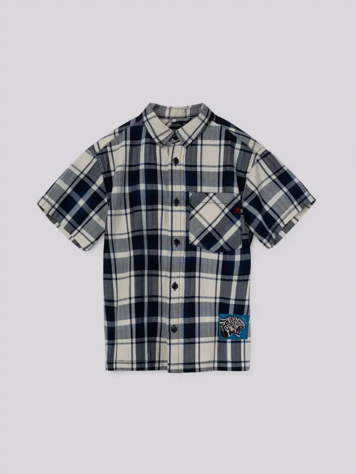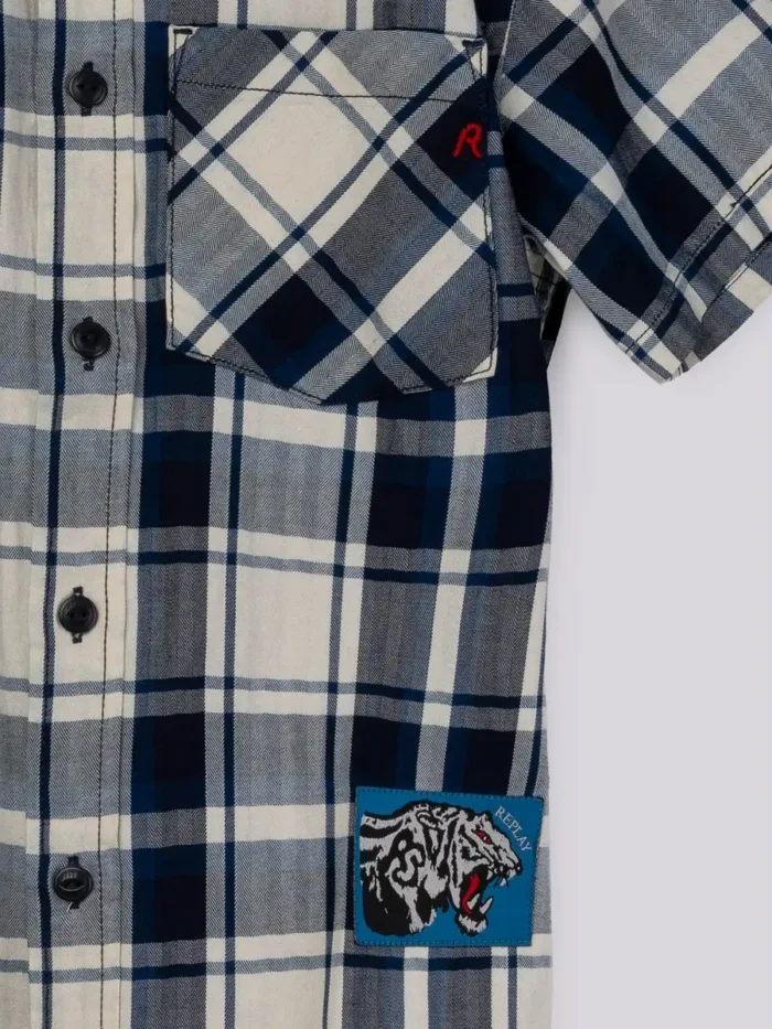 Lühikeste varrukatega pehmest puuvillast särk, millel on üleni indigoruuduline muster. Sellel disainil on terav krae, R-tikandiga rinnatasku ja klassikaline eesmine nööbiliist. Värviline küljeliist möirgava tiigri ja Replay kirjaga lisab viimase lihvi.