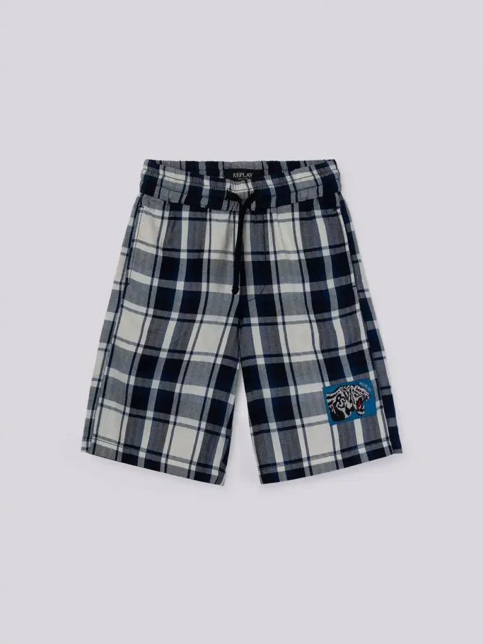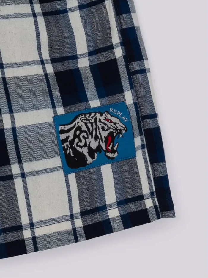 Puhtast puuvillast avara lõikega lühikesed püksid, millel on üleni indigoruuduline muster. Püksil on veniv pingutusnööriga vöökoht ja kaks mugavat küljetaskut. Möirgava tiigri embleem ja Replay kiri säärel täiendavad disaini.