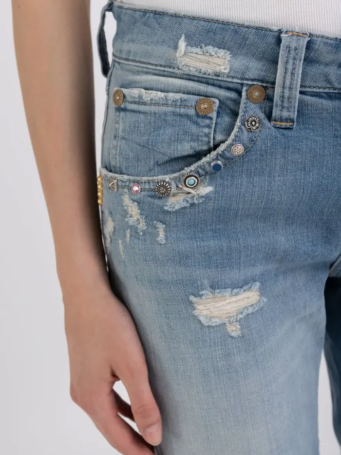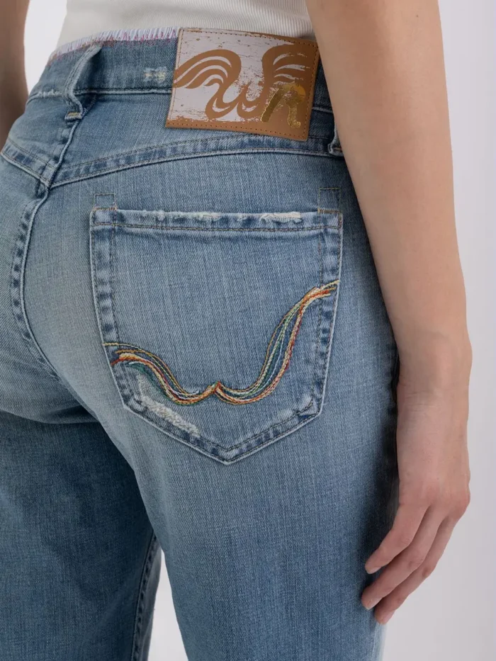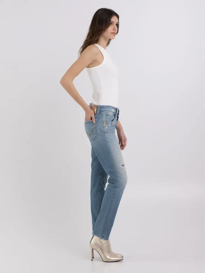 Slim fit teksad, mis on valmistatud 12 untsi valgest koemustast puuvillasest mugavast teksast, millel on must pesutoon. Tavalise vöökoha ja saleda säärega rõivast iseloomustab V-kujuline seljaosa, mis tõstab esile naiseliku silueti. Viie taskuga esemel on kasutatud aladel vurrud ja kontrastsed värvid, samas kui valgendiga töötlemine tekitab servadele väikeseid marrastusi ja parandab purunemisi. Pükse viimistlevad tõmblukk ja nööpkärb ning värvilised kivikivid esitaskute servadel. Kollektsioon We Are pärineb kaubamärgi arhiividest ning kehastab ainulaadsel ja originaalsel viisil Replay kaubamärgi juuri. Iga tehnika ja viimistlus tähistavad selle Made in Italy kollektsiooni käsitööna valminud meisterlikkust ning tugevat ja eklektilist hõngu.