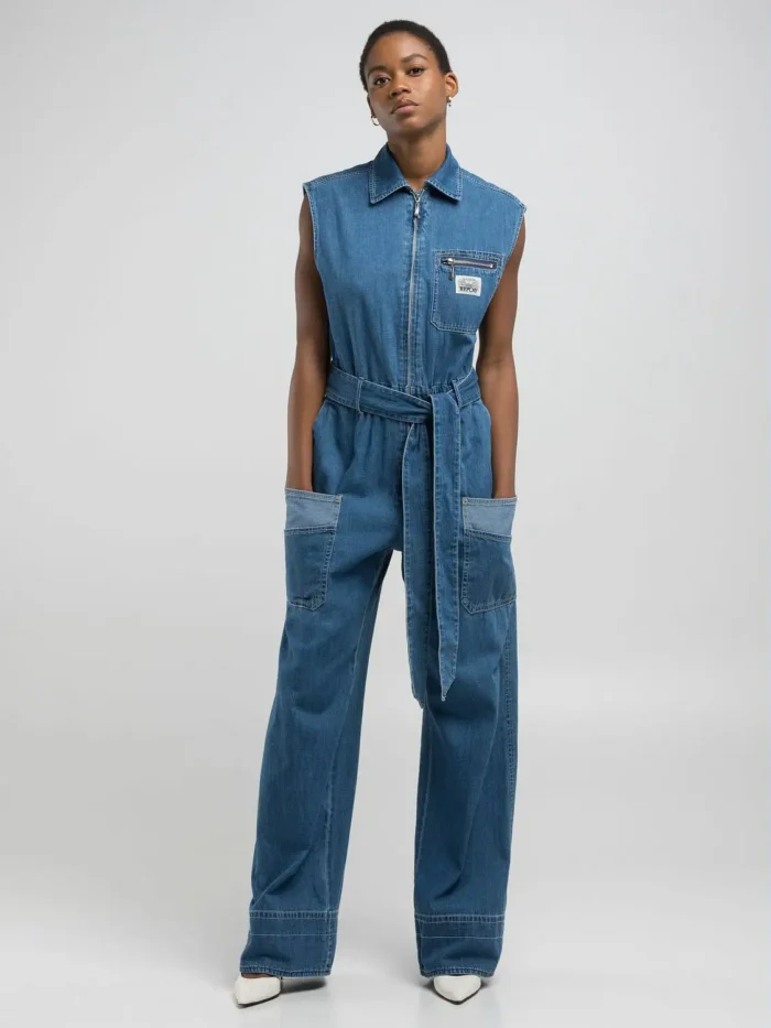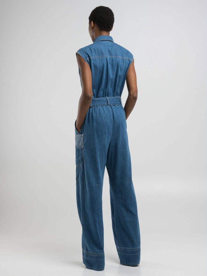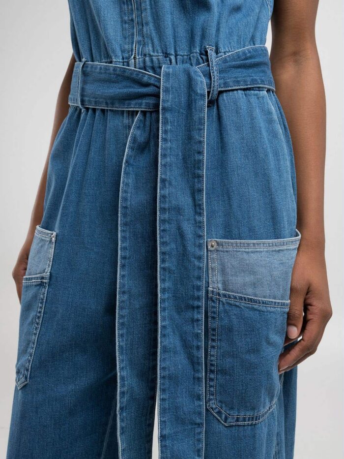Täispikkuses lukuga varrukateta kombinesoon 8-untsisest puuvillasest indigosinist teksariidest, millel on keskmise tooniga kivipesu ja marmorjas efekt. Sellel vabaaja lõikega rõivaesemel on lukuga rinnatasku, millel on Replay silt, ja kaks suurt pealekantavat taskut külgedel. Sobiv vöö sobib ideaalselt vöökoha pingutamiseks ja täiendab disaini.