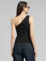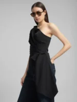 Ühevärviline veniv nailonsegu twill-kangast topp. See ühe õlaga mudel on asümmeetrilise disainiga, millel on spetsiaalne vöökoht vöökohal ja kortsus efekt esiküljel.