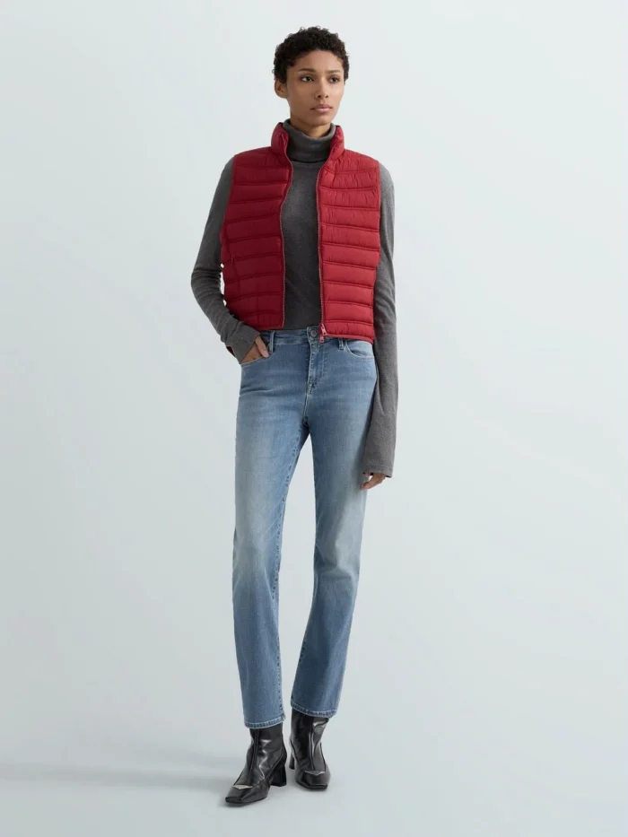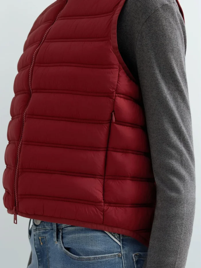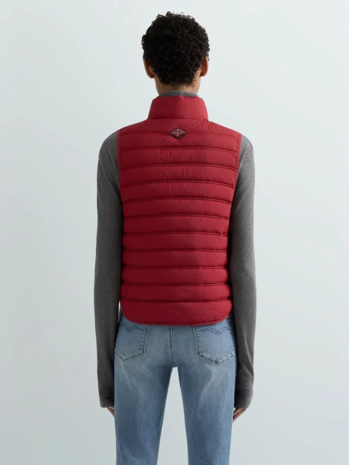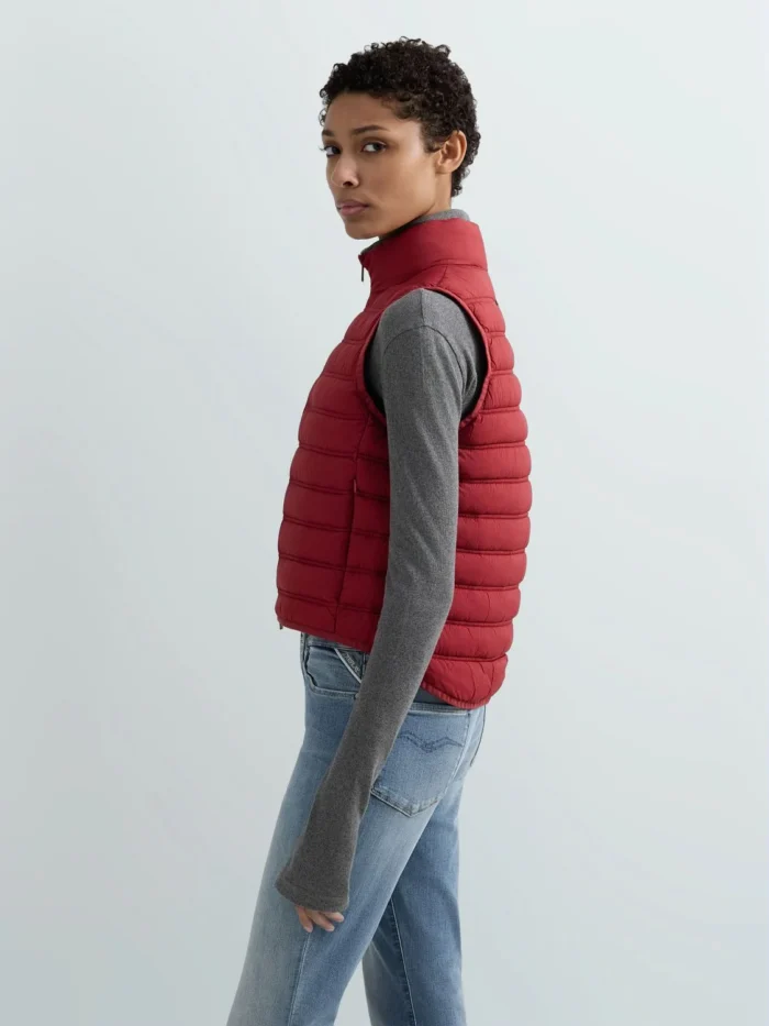 Tavalise lõikega polsterdatud ja tepitud vest krabiseva efektiga nailonkangast. Mudelil on püstkrae, kaks praktilist küljetaskut ning kahesuunaline lukkkinnitus. Seljaosal on viimistluseks ikooniline teemantlogo – Replay iseloomulik detail.