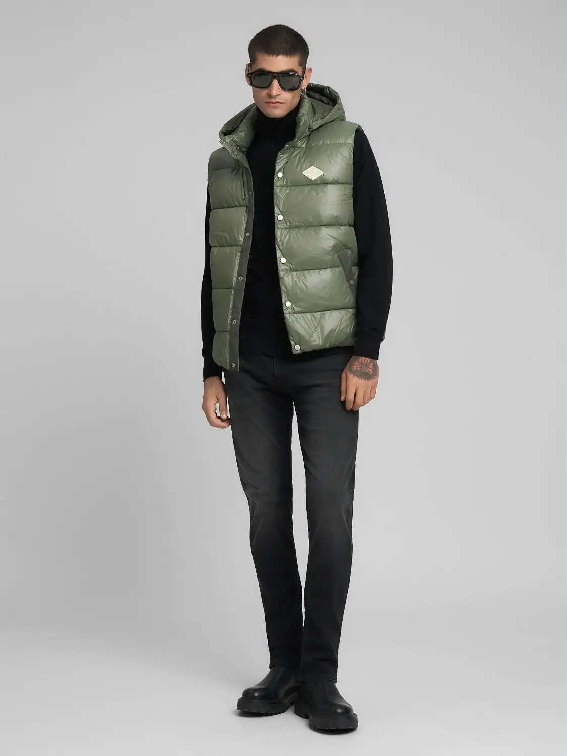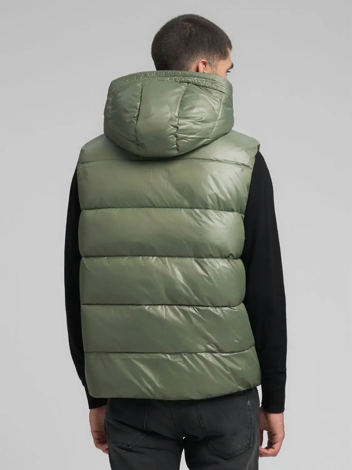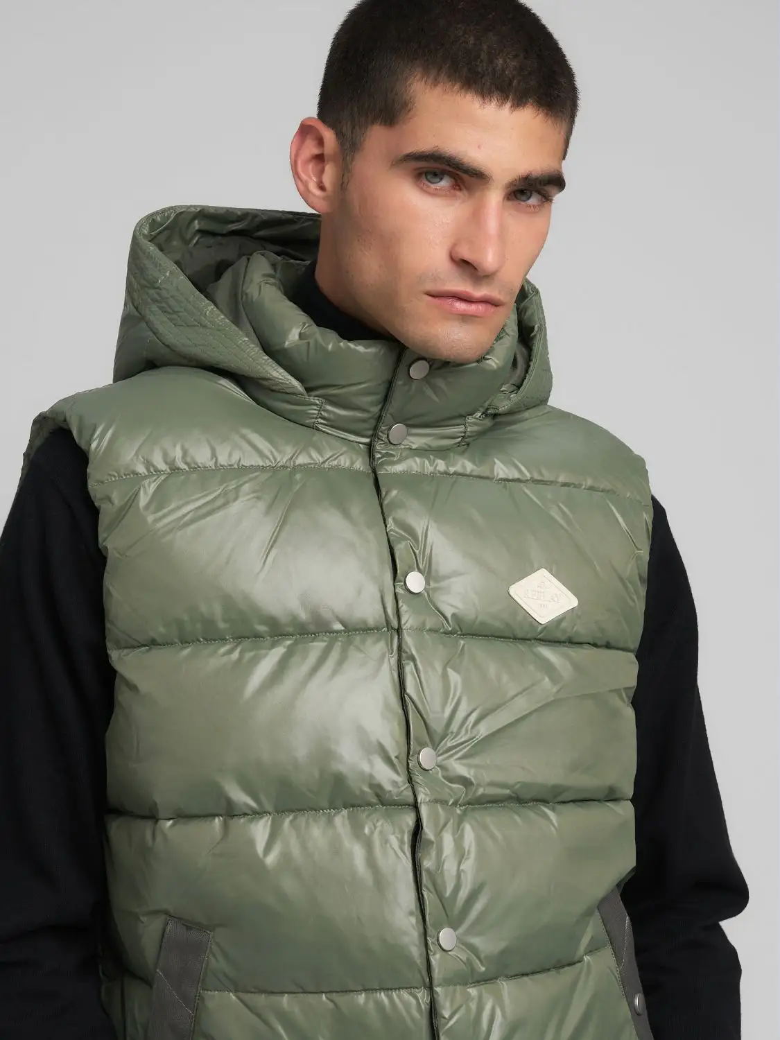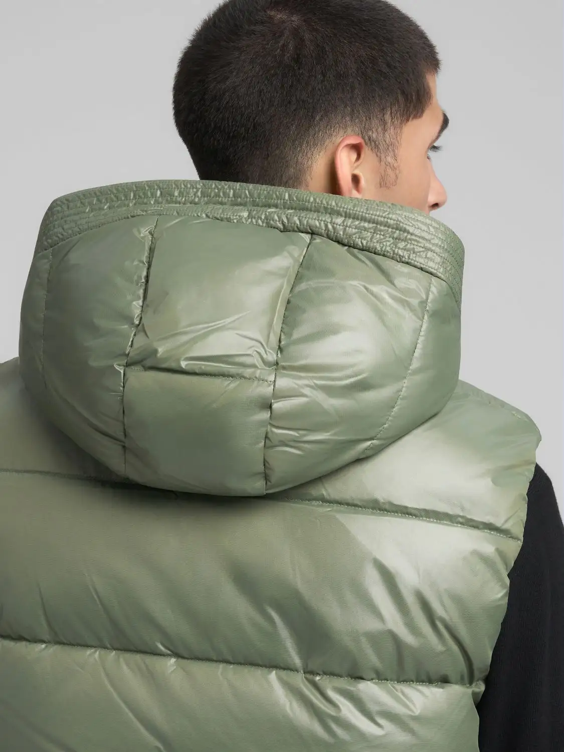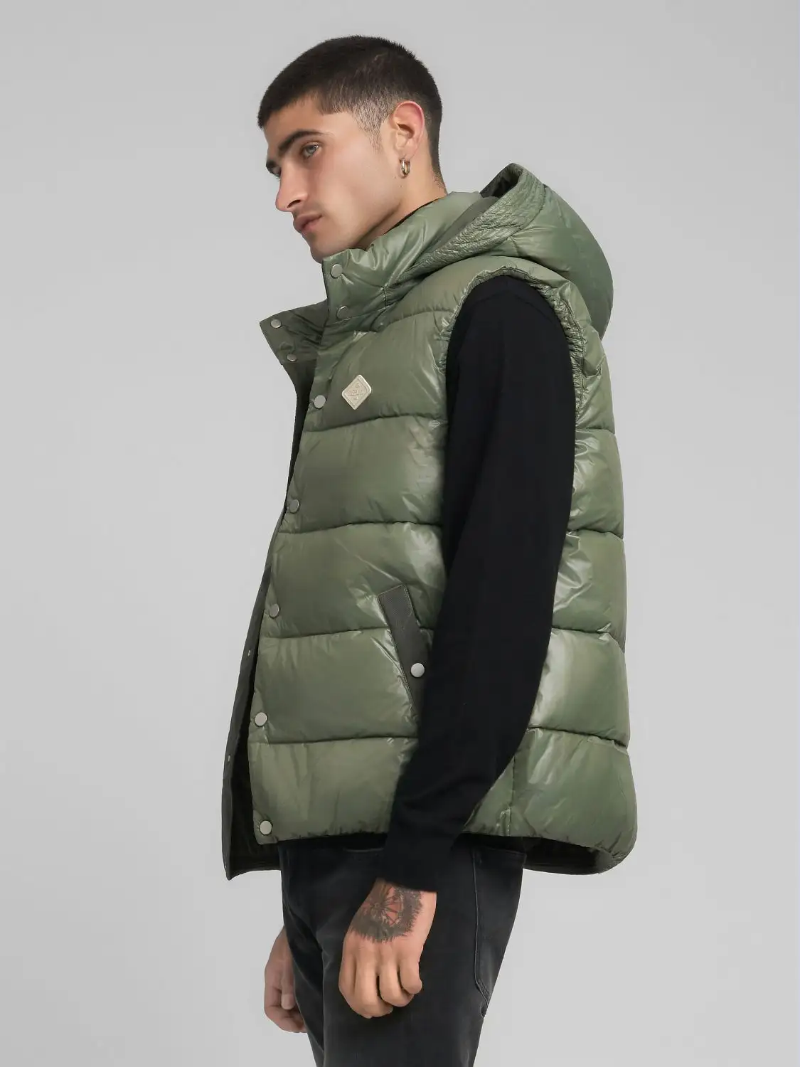 Tavalise lõikega polsterdatud ja voodriga vest horisontaalse tepitud õmblusega, valmistatud läikiva viimistlusega taaskasutatud polüestrist – jätkusuutlikust materjalist, mis on keskkonnasõbralik valik. Vestil on horisontaalse soonikkoes kootud äärega kapuuts, lisakaitseks püstine krae ja kaks nööpidega küljetaskut, millel on kontrastne ääris. Rinnale jääb eksimatu Replay teemant. Ees nööpkinnitus. 100% POLÜESTER;