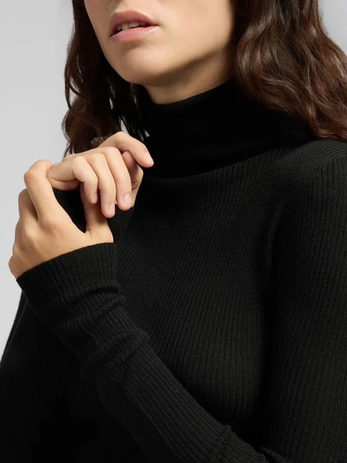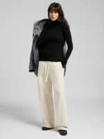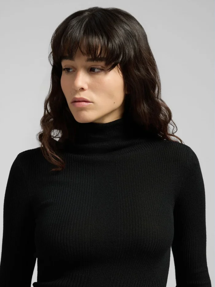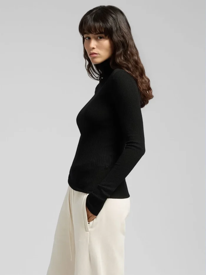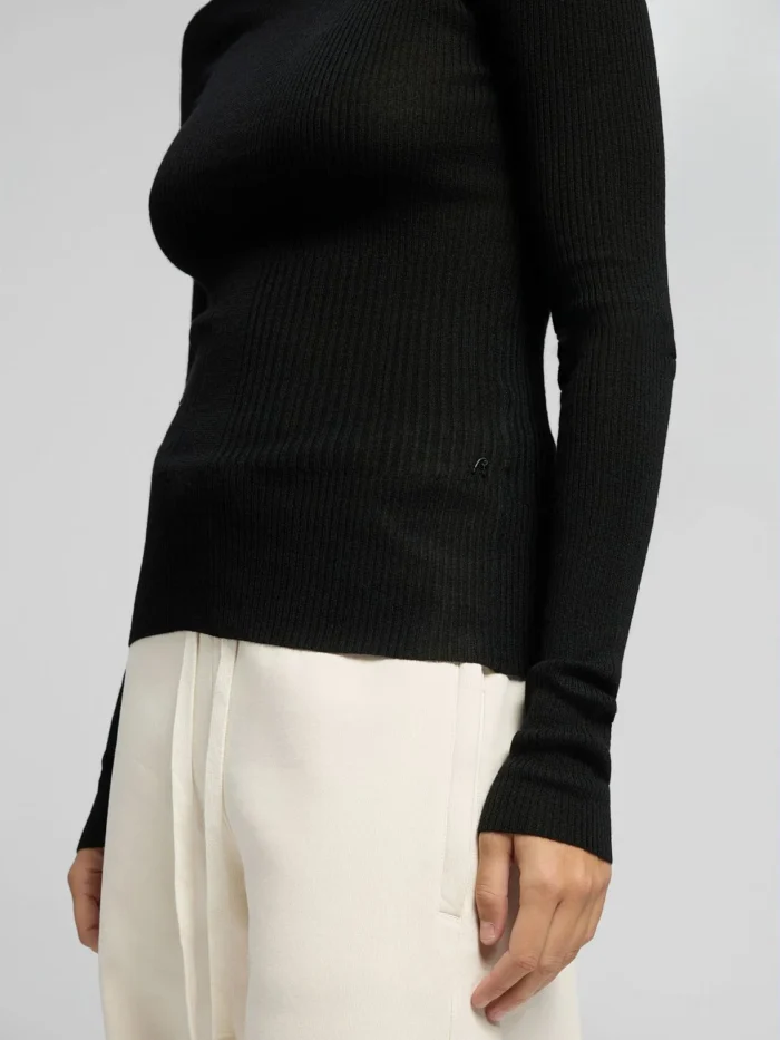 Kitsa lõikega kaelusega pullover puhtast villast. See liibuv mudel on kootud erineva paksusega soonikuga üle rõivaeseme. Disaini täiendab küljel olev R-detail, mis on brändi sümbol.