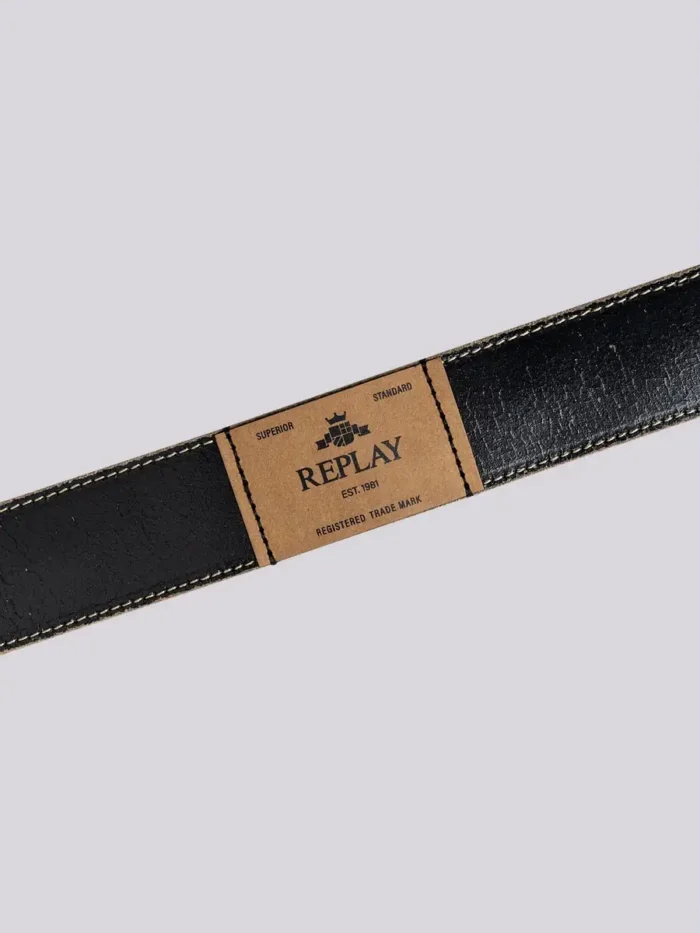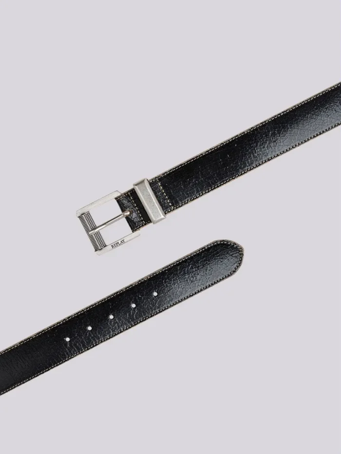 Vöö on valmistatud omapärasest säriseva efektiga veisenahast. Mati viimistlusega ruudukujuline lukk, millel on veidi ümarad nurgad, tekstuursed detailid ja graveeritud Replay logo. Metallist vööaas. Kõrgus: 4 cm.